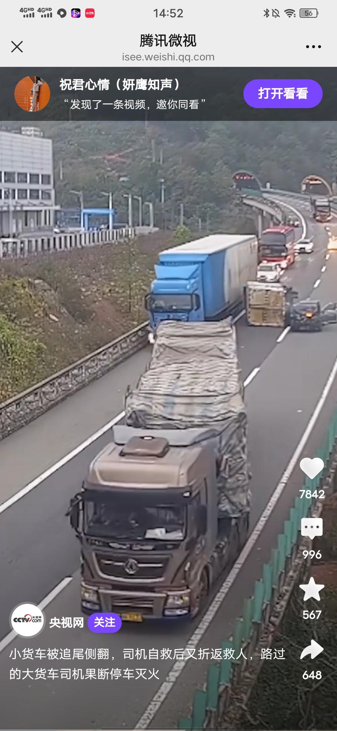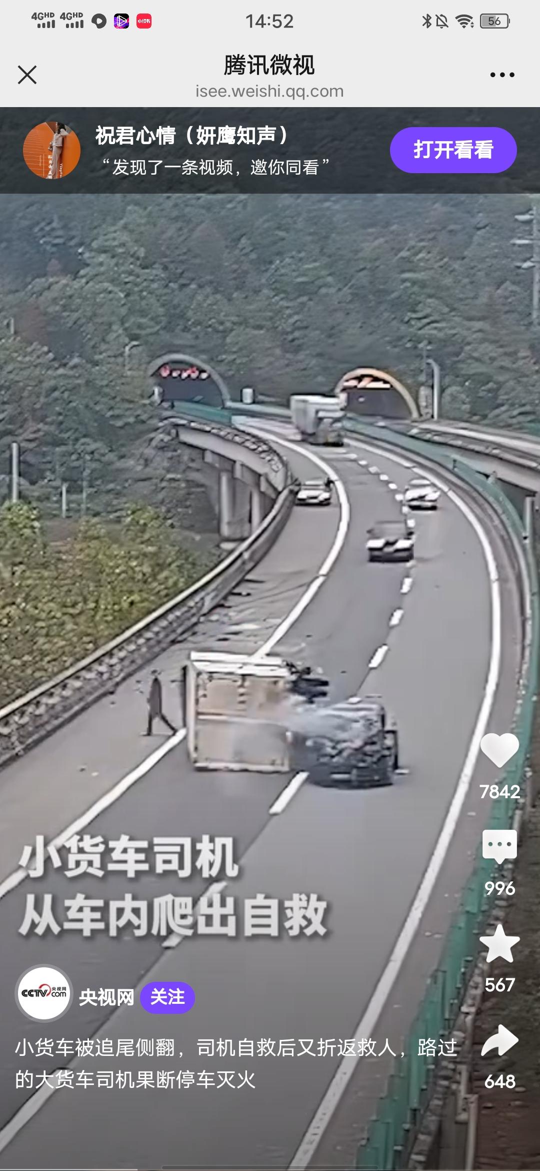 小货车被追尾侧翻,司机自救后又折返救人,路过的大货车司机果断停车灭火。 据央视网报道,一小车高速路上行驶,撞上了前方的小货车,致使小货车失控侧翻,小货车司机自救后又折返去救小汽车里的人,将小汽车驾驶员抱了出来,路过的大货车司机见状,果断打开双闪靠路边停车,下车施救,灭火。事后民警赶到现场处理,判定小车全责,因为连续开了超4个小时了,属于疲劳驾驶。 所以这里首先提醒各位,一定一定要注意安全驾驶啊,因为这不仅关系自己的安全,还有别人的安全,有点社会公德心,不要因为自己的疏忽,或者因为自己的责任,祸及别人,人人都要注意安全! 另外,这小货车司机和大货车司机都是有担当,有责任心的好人,善良的人,祝愿好人一生平安! 社会百态