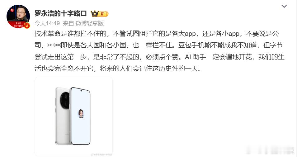 罗永浩谈豆包手机AI Agent重构手机交互,努比亚敢做先行者,把Nebula-GUI这样的技术落地到机型上,这份魄力也挺难得!目前AI手机没有成熟模板可抄,质疑声自然难免,但正是这种敢闯的态度,才推着行业进步。罗永浩点赞这波创新,连努比亚高管都回应认可,足见共识正在形成。AI手机的未来,不就是在这样的试错与突破里才进步吗?豆包手机中兴努比亚高管点赞罗永浩