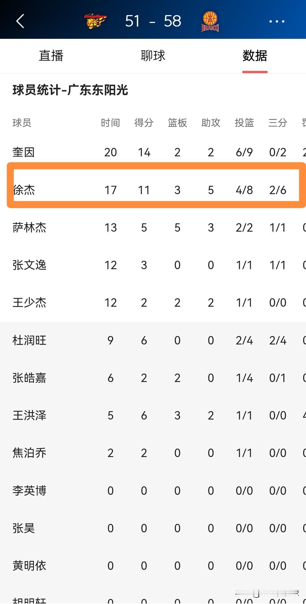 广东东阳光超级后卫徐杰不愧是球队的大腿!在今天进行的广东东阳光和山西汾酒的比赛中目前双方半场战罢,虽然广东队暂时以51:58落后于对手,但是徐杰的表现却非常出色。 在前两节比赛中,徐杰首发出战17分钟,投篮8中4,其中三分球6中2、罚球2中1得到11分3篮板5助攻。
