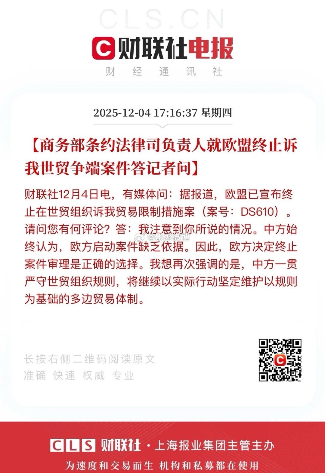 盘后两大利好,⒈央行12月5日开展1万亿元买断式逆回购。这是向市场投放净流动性。相当于变相降息了!⒉欧盟撤诉!欧盟终止诉讼我国世贸争端案件。咱虽然不知道欧盟幡然醒悟诚意几何?但小学生都看得明明白白的,欧盟2027年要彻底切断俄气,改为进口卡塔尔和美国的天然气。但是卡塔尔和美国又是从俄罗斯手上买的,换了个名头罢了,关键价格翻番。那欧猪岂不是成了大冤种?这就非常有意思了…如果从东大这边买,虽然东大也是转手的俄气,但是算上船员费转口贸易的税费和利润,可能价格也只要美气的7成左右,这个账老欧应该能算明白!Ai时代要是没有能源,那么老欧家会被时代抛弃…