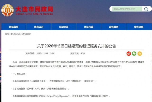 为进一步优化婚姻登记服务,满足市民朋友在节假日期间办理婚姻登记的愿望,根据《国务院办公厅关于2026年部分节假日安排的通知》精神并结合本市婚姻登记工作实际情况,现对2026年大连市元旦、春节、劳动节、国庆节假期首日上午结婚预约登记服务安排如下: