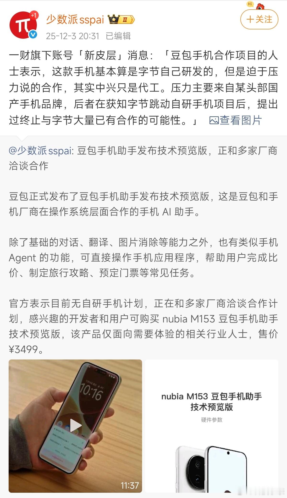 豆包手机现在想想,要是字节把当时收购的锤子坚持做下去,或者哪怕现在拿出来直接沿用锤子的设计呢,感觉颜值和热度都还没能在上一层楼!PS:据悉豆包手机实际上完全是字节自研的,迫于压力才说和中兴合作,其实中兴只是单纯代工而已。PPS:看到越来越多的APP开始封杀豆包,但叫我感觉好像也并不是在怕什么,更多的应该还是在保护用户隐私吧,毕竟豆包目前的这种操作方式,对于大多APP来说其实跟病毒是一样的……