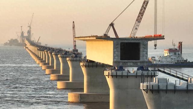 近日,通苏嘉甬高铁的控制性工程杭州湾跨海铁路大桥,宁波侧首孔箱梁顺利架设,标志着大桥的海中引桥进入全面架梁施工阶段。杭州湾跨海铁路桥全长29.2公里,采用时速350公里的双线无砟轨道设计。