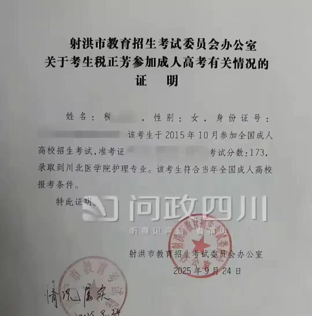 这个口子不能开!考公考编是不允许学历重叠的。这个考生还是00后,成人高考只考173分,暗自为她捏把汗。 00后高考考个全日制大专都是很容易的,要知道成人高考三门课总分是450分,说明173分,三门课平均还不到60分,这该有多差啊! 2015年的全国成人高考报名条件明确指出,只限非在校生等人员报考,在校生是不得报考的。她又是怎么通过报考的? 难道是报名的时候没有如实填写信息?隐瞒了自己是在校生的身份? 但招生办的一张证明,落款是2025年9月,说是该生符合当年成人高校报考条件。这到底是怎么回事? 职业中专没毕业,就开始读大专了,这种读法是对别人不公平吧,读中专和读大专怎么可以同时进行呢? 当地卫健局审核还是很仔细的,现在考个大专二三百分就可以读了。建议考事业编要全日制本科学历。