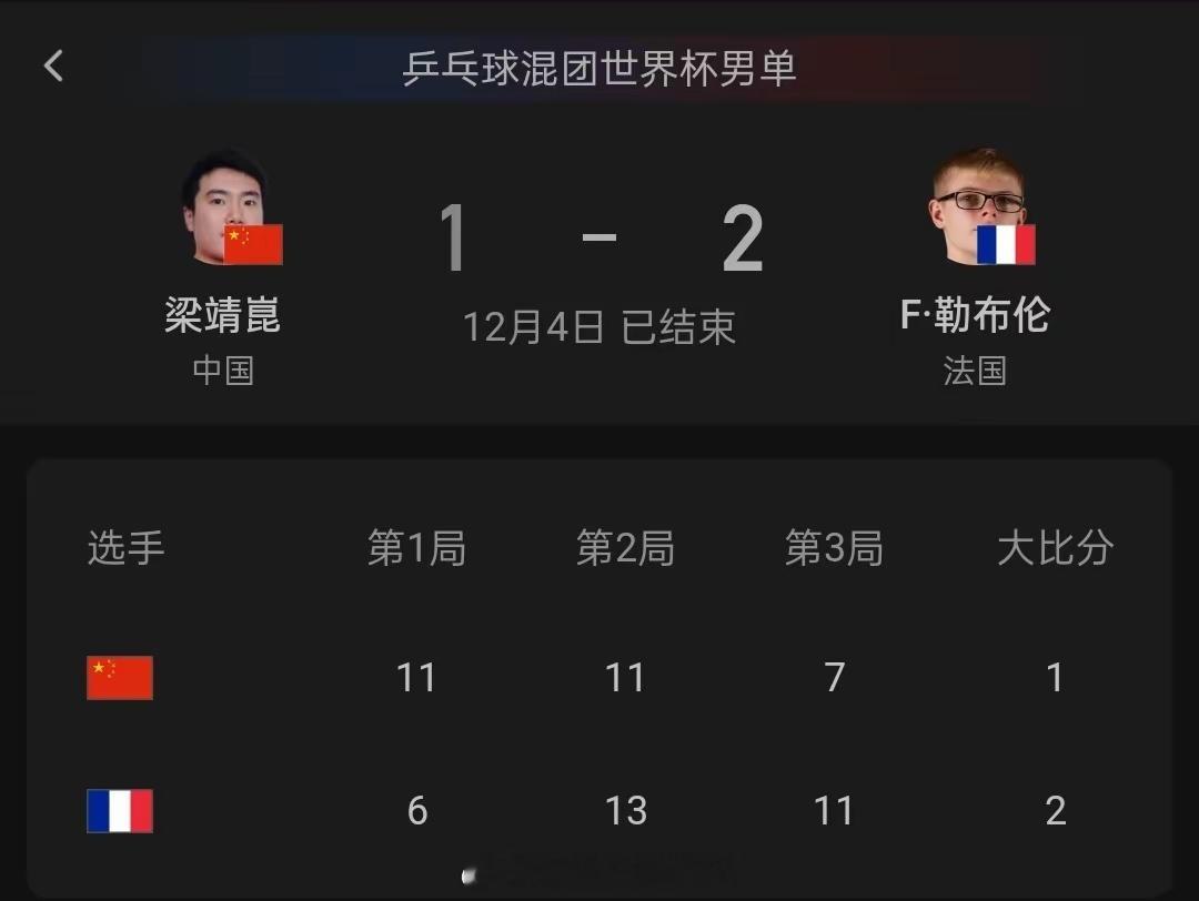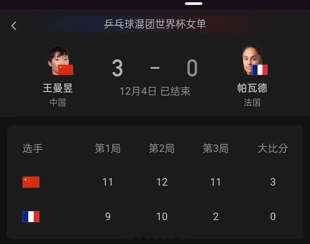 乒联混合团体世界杯战报!8-2!莎头组合零封对手,中国大胜法国国乒8比2法国体育 12月4日成都乒联混合团体世界杯!迎来第五个比赛日,中国军团上午对阵韩国军团,最终中国军团8-0横扫韩国军团,傍晚比赛中国军团对阵法国军团,最终中国军团8-2击败法国军团,中国军团单日双赛取得全部胜利!第一盘混双比赛!中国组合孙颖莎王楚钦迎战法国勒布伦袁嘉楠组合,莎头组合一直都是国内最强的混双组合,排名也是相当高,首局比赛,法国组合开局2-0领先,很快莎头组合迅速调整,很快就追平比分,最终莎头组合11-7率先拿下第一局比赛,第二局比赛,双方进入激烈争夺状态,比分一直没有拉开,最终莎头组合以12-10险胜过关,第三局,莎头组合开局打得不错,最终以11-5拿下第三局,总比分3-0帮助中国军团拿到第一1分,第二盘比赛,王曼昱VS帕瓦德,王曼昱作为国内2号选手,世界排名第一名,全运会女单冠军,帕瓦德法国一姐,实力不容小视,首局比赛,两人激烈争夺,比赛打得相当艰难,王曼昱以11-9险胜过关,第二局,两人进入比赛状态很快,帕瓦德一直咬住比分,双方一直激烈争夺,比赛最终王曼昱以12-10再次险胜过关,第三局,王曼昱上来就一波流,帕瓦德连续失误,单局仅仅拿到2分,王曼昱以11-2轻松拿下总比分3-0横扫帕瓦德拿到第二2分中国取得6-0领先优势,第三盘比赛,梁靖昆VS勒布伦,两个人实力不相上下,排名也是相当接近,首局比赛,梁靖昆一度取得5-3领先优势,随后被勒布伦追平,最后阶段梁靖昆打出一波6-1以11-6率先拿下第一局,第二局,梁靖昆一直领先一度10-6率先拿下局点,最终被勒布伦挽救4个局点追平,最终勒布伦13-11完成了逆转,第三局,梁靖昆开局就一直落后,最终勒布伦11-7连下两局完成了逆转,拿到第三盘比赛,让比赛充满悬念。第四盘比赛:林诗栋王楚钦组合迎战,勒布伦兄弟组合,首局比赛,双方激烈争夺,最终林诗栋王楚钦以11-9险胜勒布伦兄弟组合结束了本轮对决,中国军团8-2战胜法国军团。