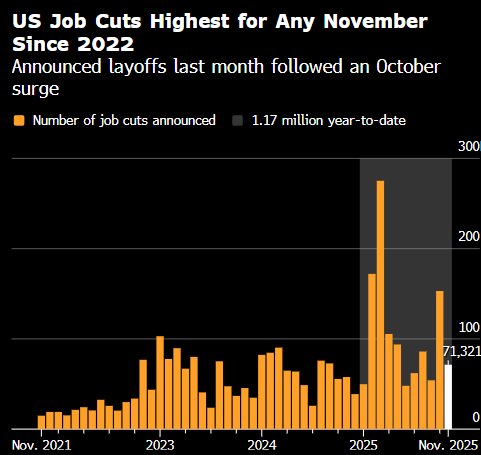 该机构周四表示,企业在11月宣布裁员71321人。这个数字约为前月的一半,美国企业10月宣布的裁员规模是二十多年来同期最高水平。