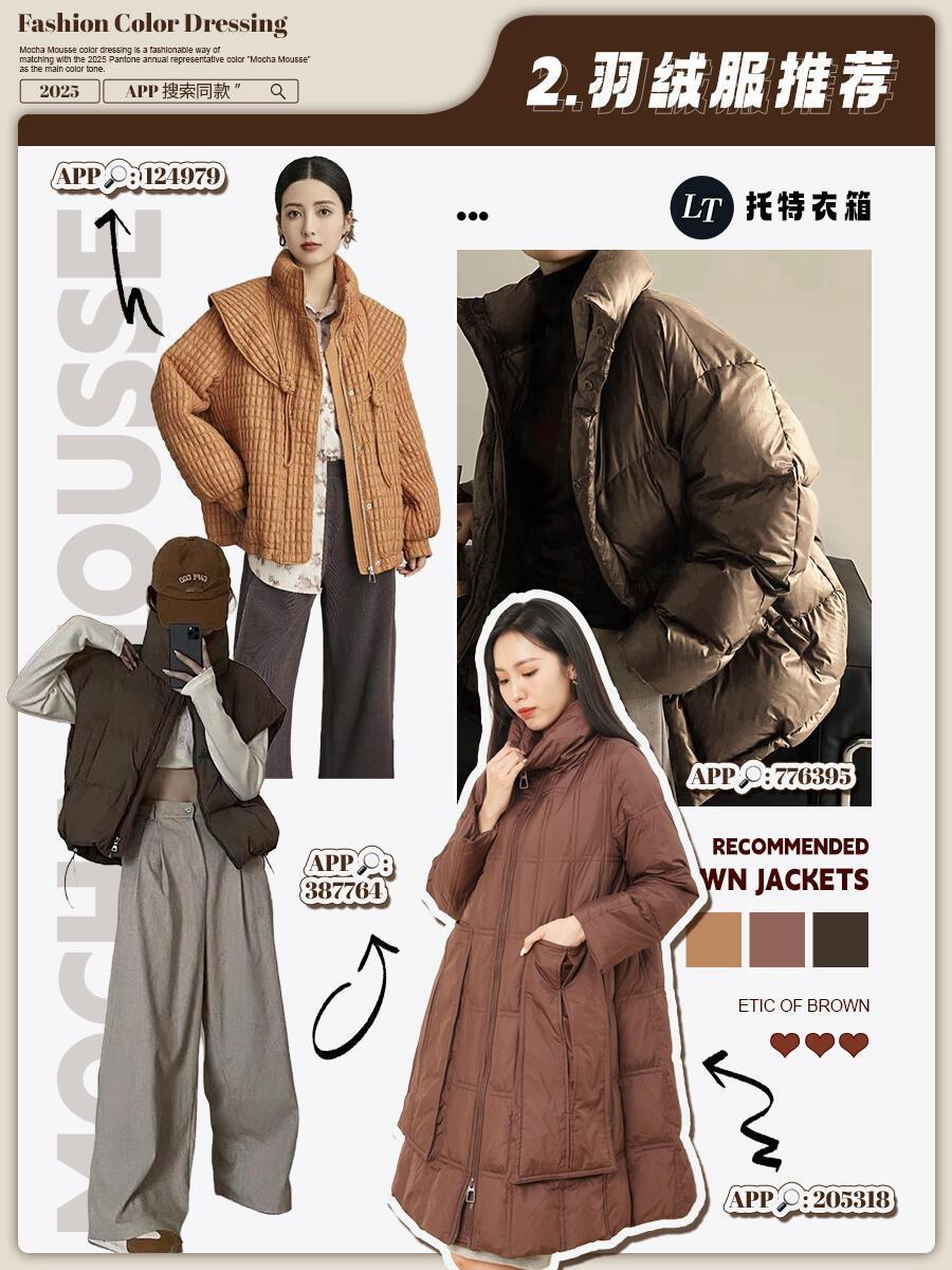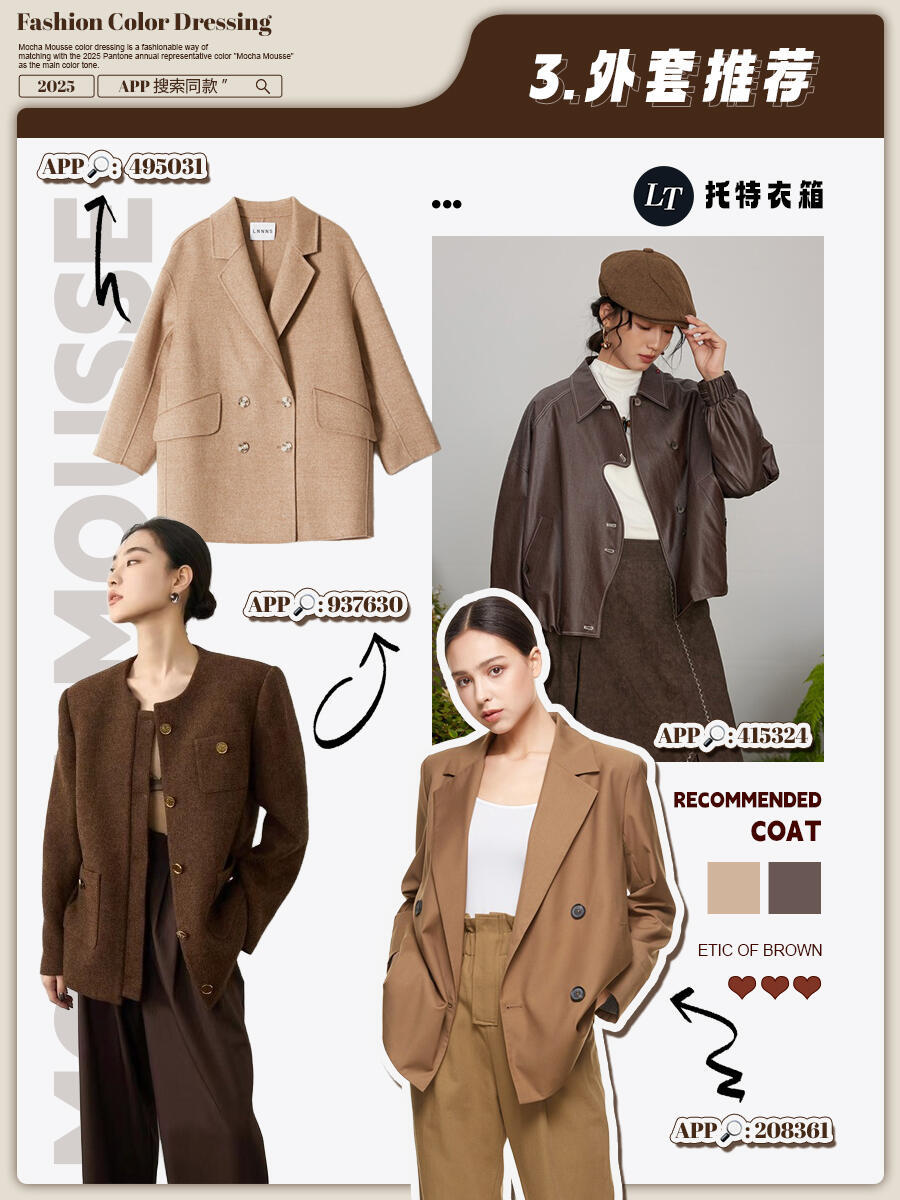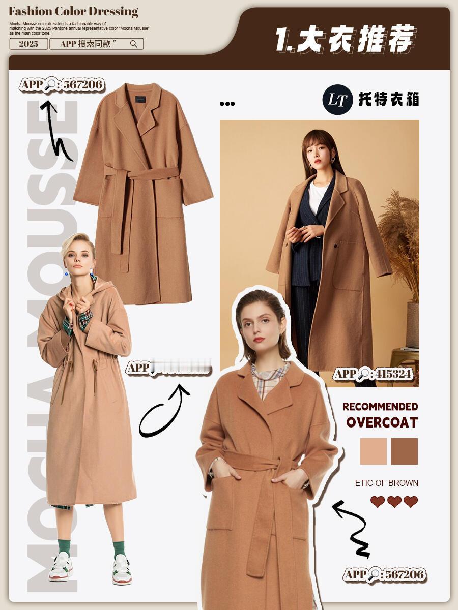 摩卡慕斯风格大赏2025年色彩记忆 这两年冬天,从美拉德到巴恩风,棕色系一直是穿搭顶流,2025年轮到摩卡慕斯色C位出道,妥妥的冬季新宠。它就像一杯丝滑的摩卡甜品,介于咖啡和米色之间,既有咖啡的醇厚,又有奶油的柔和,暖乎乎的还自带高级感,黄皮穿也不踩雷。穿搭超简单:大衣、羽绒服选这个颜色,内搭浅毛衣+牛仔裤,日常穿百搭又时髦;想加点细节,配条同色围巾、帽子,或者一双摩卡慕斯色靴子,保暖又出彩。这颜色饱和度低,跟啥色都能搭——配白色显温柔,搭黑色显气场,配蓝色还带点复古感,不用费脑就能穿出质感,冬天穿它既舒服又有品味,闭眼冲不亏!