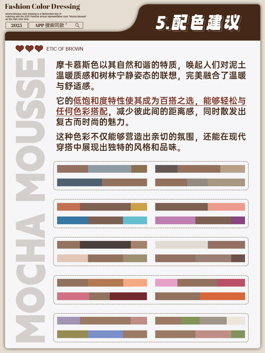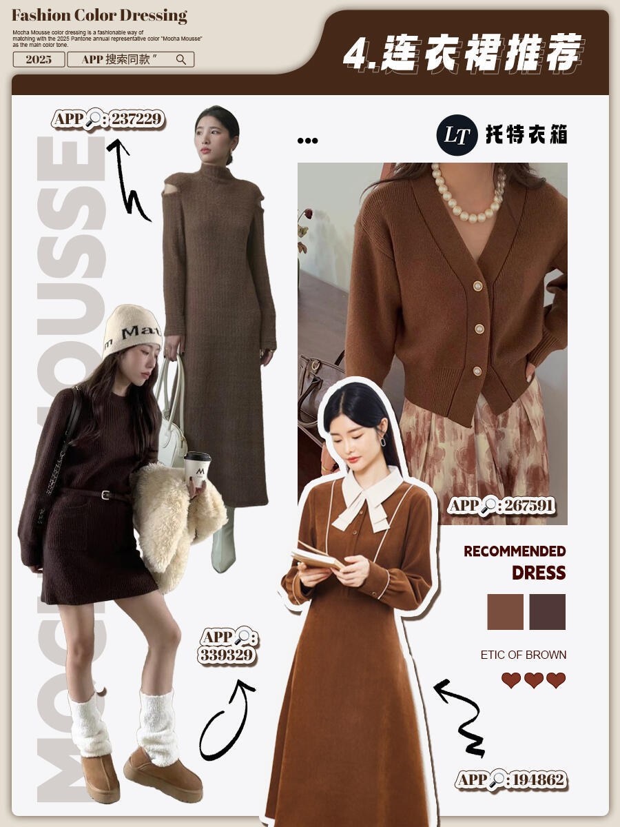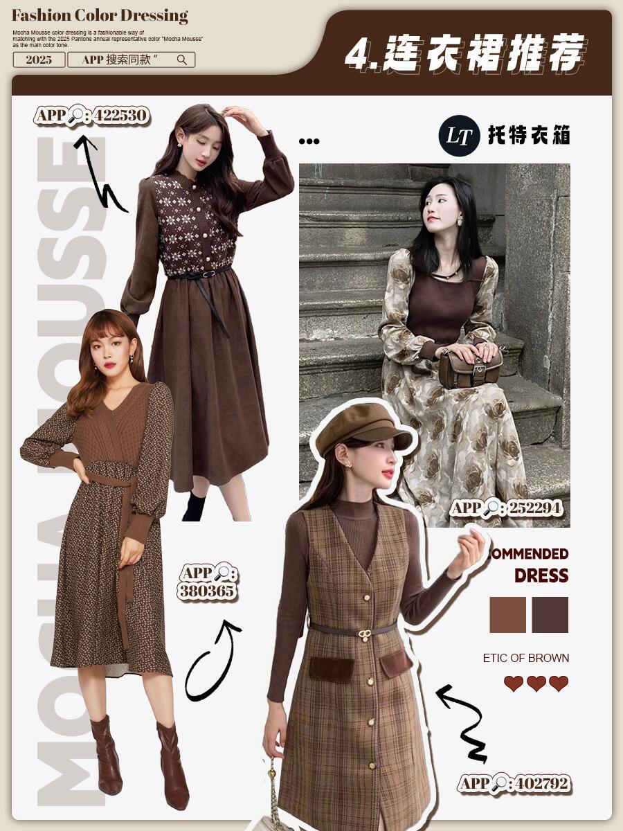 摩卡慕斯风格大赏2025年色彩记忆 这两年冬天,从美拉德到巴恩风,棕色系一直是穿搭顶流,2025年轮到摩卡慕斯色C位出道,妥妥的冬季新宠。它就像一杯丝滑的摩卡甜品,介于咖啡和米色之间,既有咖啡的醇厚,又有奶油的柔和,暖乎乎的还自带高级感,黄皮穿也不踩雷。穿搭超简单:大衣、羽绒服选这个颜色,内搭浅毛衣+牛仔裤,日常穿百搭又时髦;想加点细节,配条同色围巾、帽子,或者一双摩卡慕斯色靴子,保暖又出彩。这颜色饱和度低,跟啥色都能搭——配白色显温柔,搭黑色显气场,配蓝色还带点复古感,不用费脑就能穿出质感,冬天穿它既舒服又有品味,闭眼冲不亏!