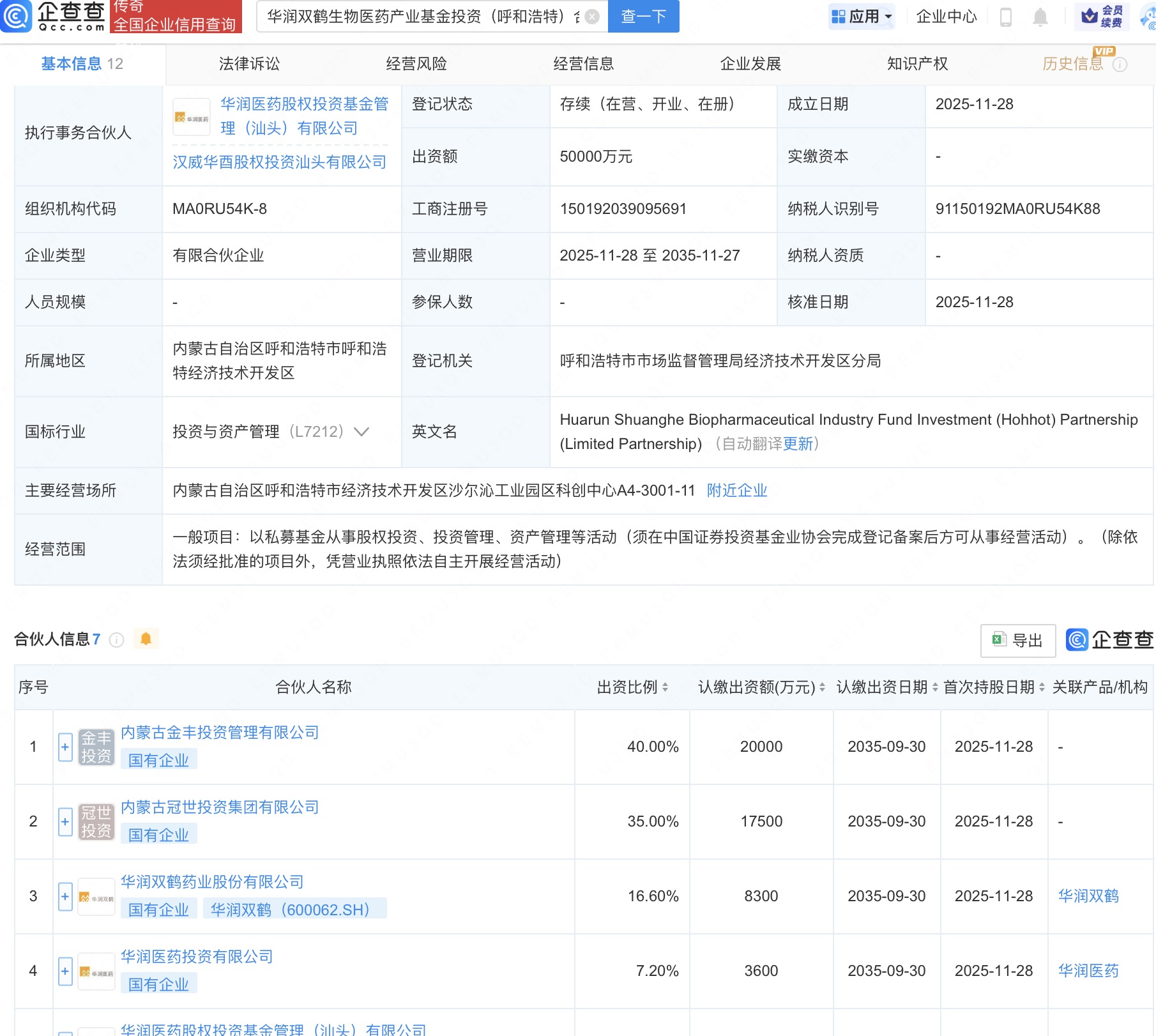 企查查APP显示,近日,华润双鹤生物医药产业基金投资(呼和浩特)合伙企业(有限合伙)成立,出资额5亿人民币,经营范围包括以私募基金从事股权投资、投资管理、资产管理等活动。企查查股权穿透显示,该企业由华润双鹤(600062)、华润医药投资有限公司、华润医药股权投资基金管理(汕头)有限公司等共同出资。