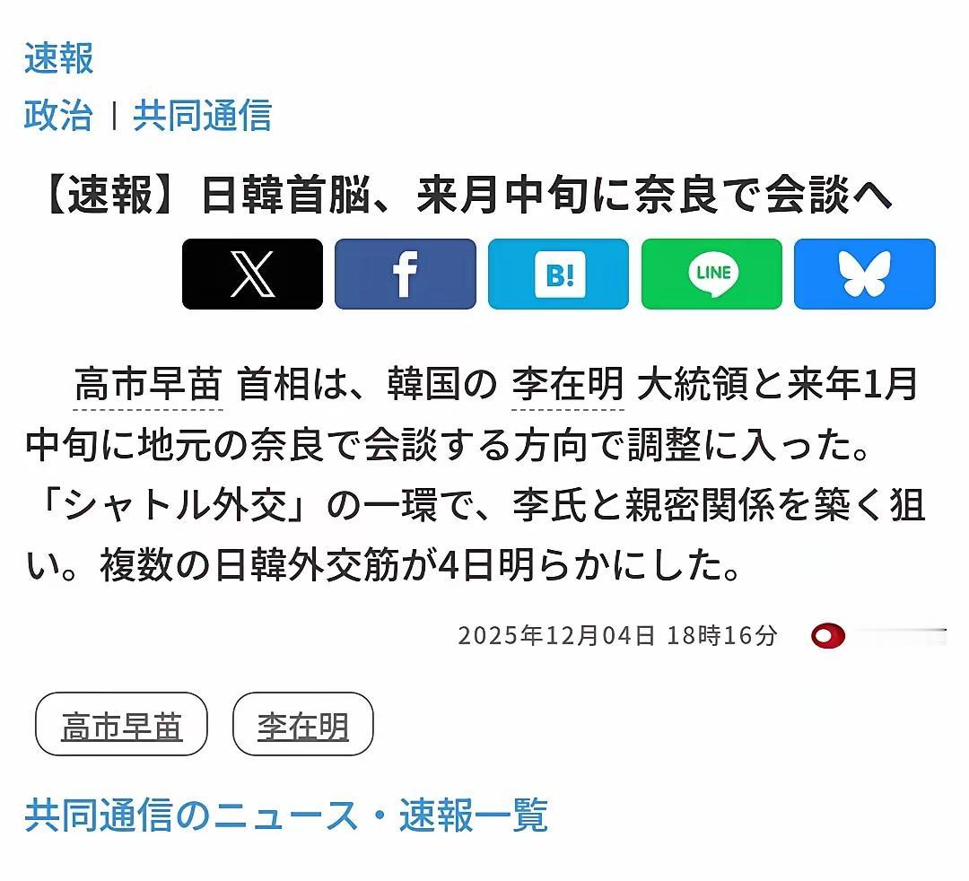 12月4号下午,根据日本和韩国外交消息人士的披露,韩国总统李在明基本确定将于2026年的1月中旬访问高市早苗的老家奈良,并且举行新一轮的日韩首脑会晤。那么如何理解这次会面的内涵呢? 这事儿挺有意思。一个曾经对日本很强硬的韩国总统,现在要去日本右翼代表人物高市早苗的老家做客。这本身就是个大消息。李在明自己都说过,当议员的时候可以强硬,当了总统就得考虑国家利益。这话说得实在。 回头看今年8月,李在明上台后第一个去的不是美国,是日本。这已经让大家很意外了。现在去奈良,就是沿着这条路继续走。他想把两国以前那种动不动就吵架的关系,变成能坐下来谈事情的关系。 他们见面聊什么?11月开会那次,本来计划聊20分钟,结果聊了40分钟。李在明说“所有担忧都消失了”。但重要的是他们没聊什么。慰安妇、强征劳工、独岛这些老问题,这次都没提。他们很聪明地绕开了这些雷区。 那聊什么呢?聊的是赚钱的事。半导体、电池这些产业合作才是重点。有报告说,光半导体合作好了,韩国企业一年能省十几亿美元。现在美国那边政策说变就变,日韩抱团取暖的想法比什么时候都强。 话说回来,表面和气归和气,底下的问题还在。有调查显示,接近七成日本人觉得历史问题道歉够了,但韩国人里这么想的只有一成。高市早苗的背景特殊,李在明在国内也有人骂他“软”。历史问题像根刺,暂时拔不掉,只能先放着。 奈良这个地方选得妙。那里有唐朝风格的建筑,能体现中日韩的文化联系,气氛上好说话。但访问本身就是政治。这次见面要看看,领导人之间的个人交情,能不能变成稳定的国家合作,不因为换领导就翻脸。 说白了,两边都在打现实的算盘。历史问题一时半会儿解决不了,但经济和安全上的压力就在眼前。他们把最难的问题先放一边,让能合作的事情快点做起来。这是没办法的办法,也是聪明的办法。 举个例子,就像两个邻居因为院墙吵过架,现在谁也不提院墙了,先一起合伙做生意赚钱。赚了钱,以后也许更好说话。李在明和高市早苗大概就是这么想的。 各位读者你们怎么看?欢迎在评论区讨论。