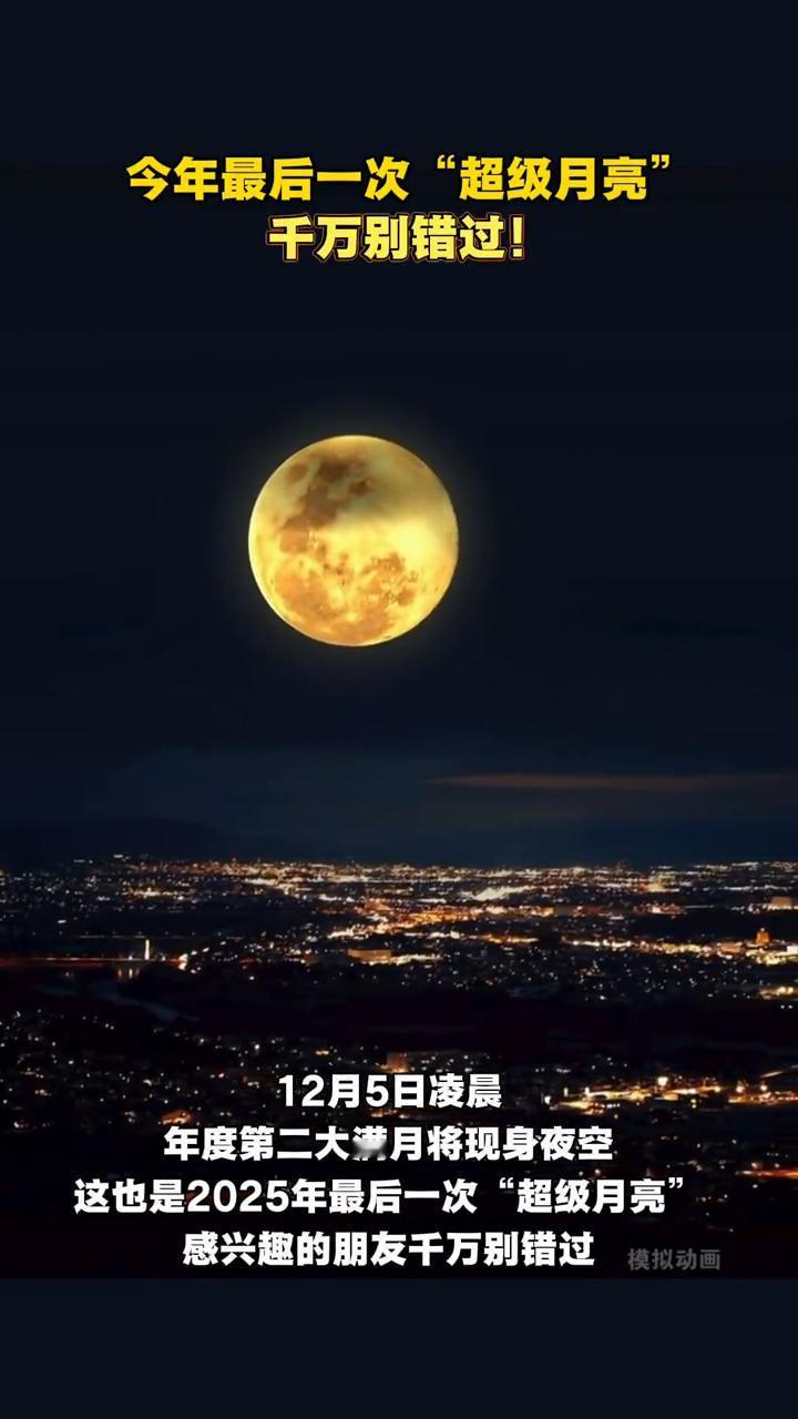 今年最后一次"超级月亮"千万别错过! 喜欢赏月的朋友可于12月4日晚开始欣赏。12月5日7时14分,月球将呈现出最完美的圆形。愿这轮圆满照亮你所有期待。12月5日凌晨,年度第二大满月将现身夜空,这也是2025年最后一次"超级月亮",感兴趣的朋友千万别错过。 文字来源央视新闻,视频来源于网络侵删。