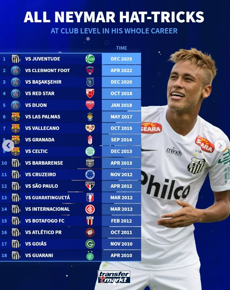 据统计,这是内马尔俱乐部生涯第18次上演帽子戏法,其中前9次都是其生涯早期效力桑托斯时做到,在巴萨效力时期对阵凯尔特人、格拉纳达、巴列卡诺以及拉斯帕尔马斯曾上演帽子戏法,转会巴黎后也曾在对阵第戎、贝尔格莱德红星等4场比赛打进3球。