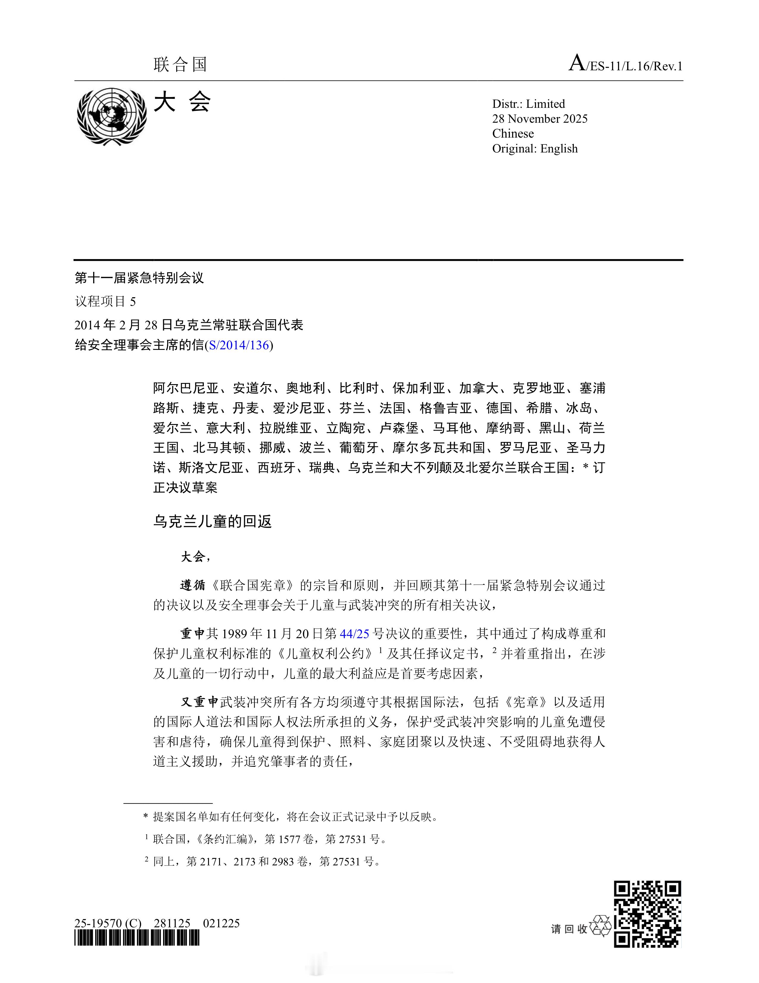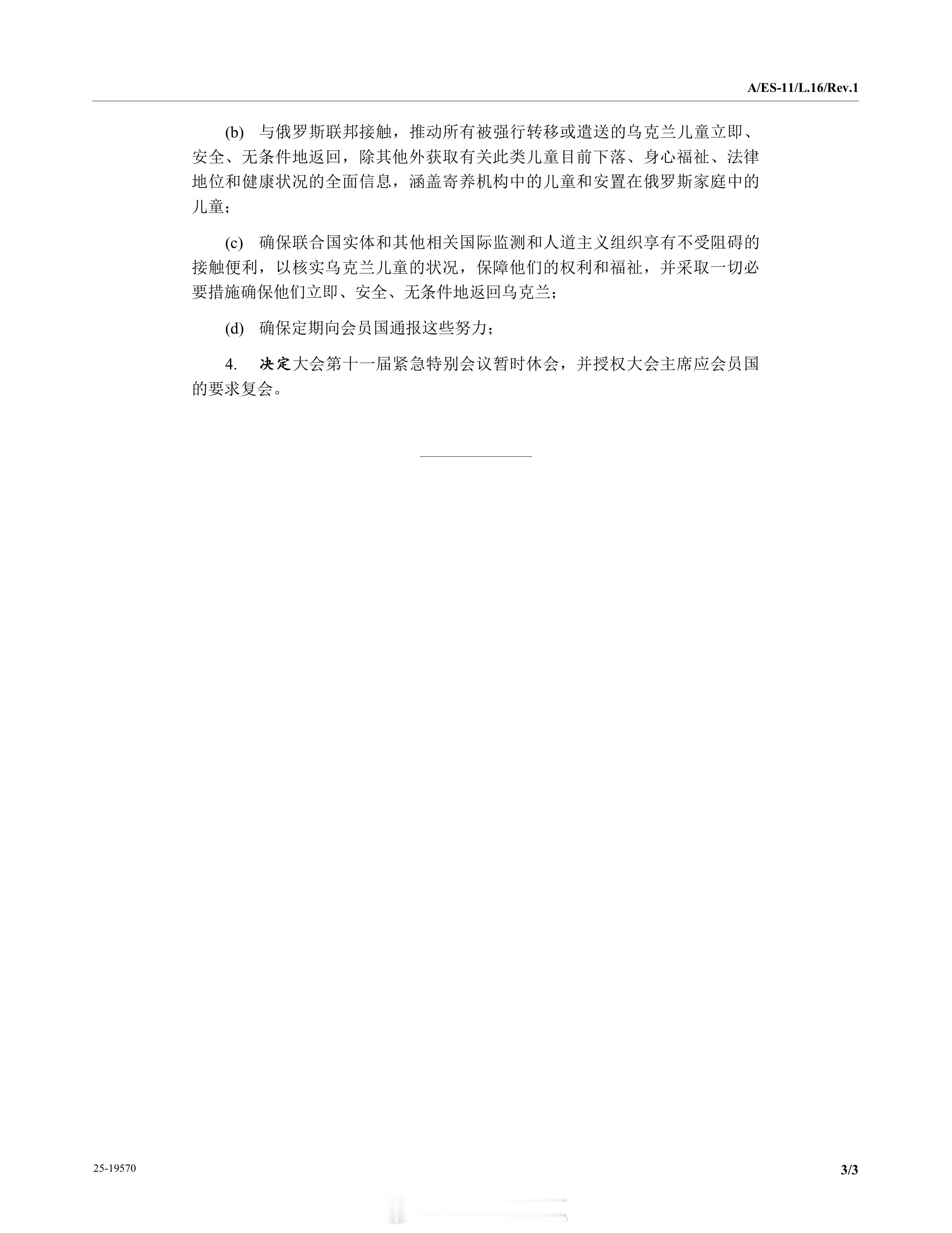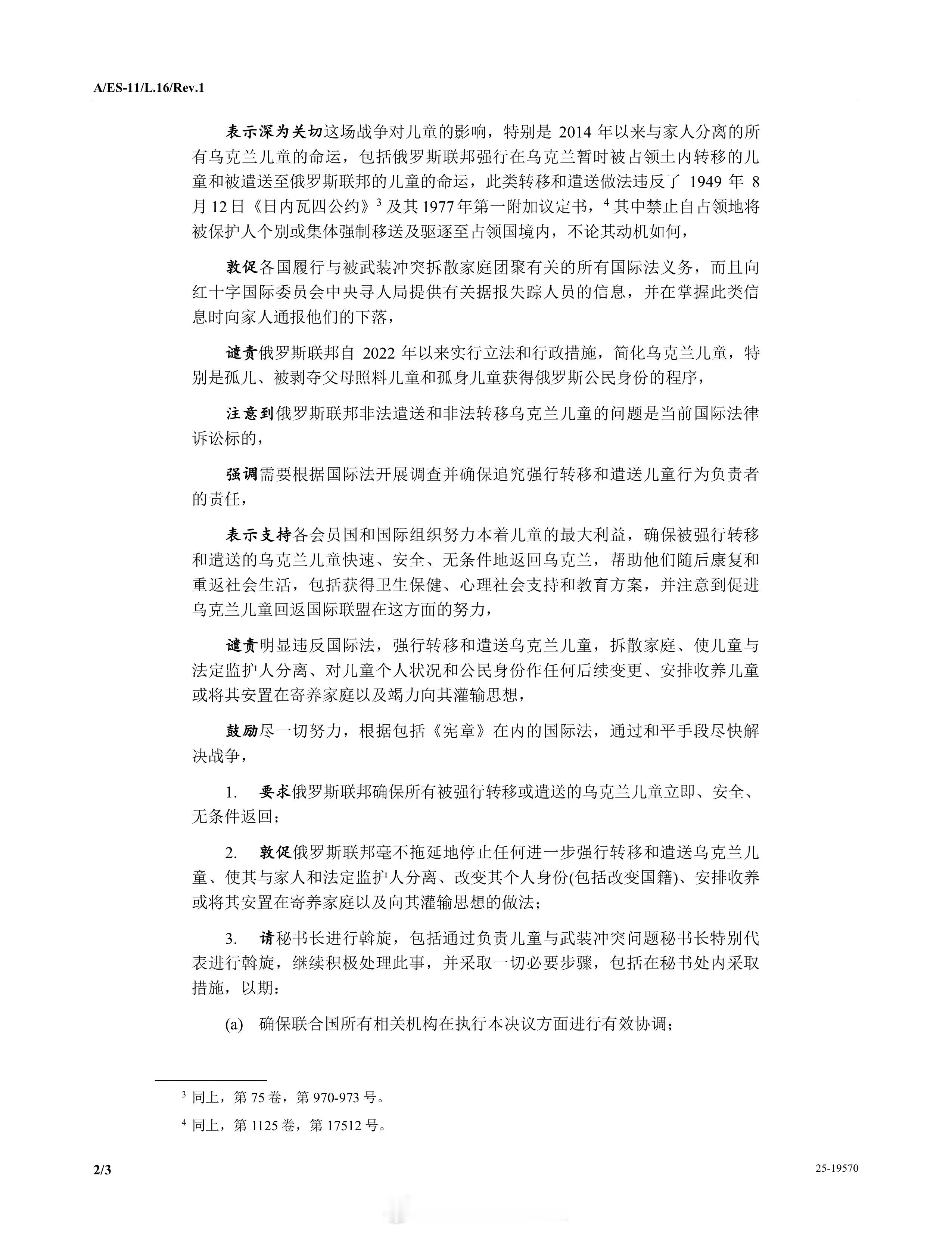 联合国大会通过了一项关于乌克兰儿童返回家园的决议91个国家支持该决议,12个国家反对,57个国家弃权。决议要求俄罗斯确保所有被强行转移或遣送的乌克兰儿童立即、安全、 无条件返回;敦促俄罗斯毫不拖延地停止任何进一步强行转移和遣送乌克兰儿童、使其与家人和法定监护人分离、改变其个人身份(包括改变国籍)、安排收养或将其安置在寄养家庭以及向其灌输思想的做法;请联合国秘书长进行斡旋,包括通过负责儿童与武装冲突问题秘书长特别代表进行斡旋,继续积极处理此事,并采取一切必要步骤,包括在秘书处内采取措施。乌克兰第一副外长基斯利察对这一决定表示欢迎,并怒斥“真是可耻的12个国家!”具体而言,这些超级大国表示反对:白俄罗斯、布基纳法索、布隆迪、古巴、朝鲜、伊朗、马里、尼加拉瓜、厄立特里亚、尼日尔、俄罗斯和苏丹。