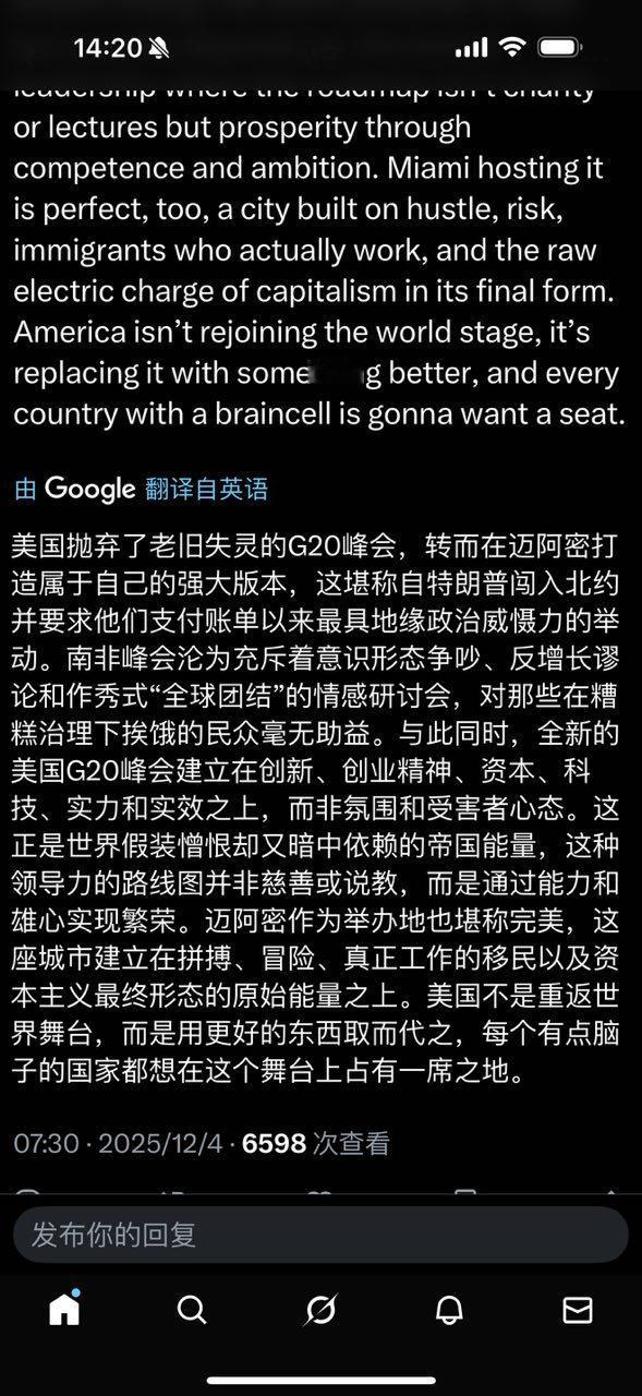 卢比奥:美国正积极推进新一届G20峰会。南非过去奉行的充满敌意、分裂和激进议程未能带来经济增长。美国的G20峰会将以创新、创业精神和坚韧不拔的精神推动美国前进,这些精神不仅使美国再次伟大,也为世界繁荣发展指明了方向。我们已准备好在迈阿密引领潮流。