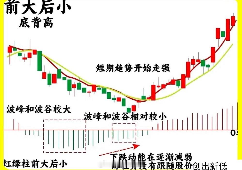 MACD经典口诀拆解:“前大后小金叉就搞,前高后低放量就跑”MACD被誉为“指标之王”,核心由快线、慢线、零轴、红柱(多方)、绿柱(空方)五部分构成,其中零轴是判断多空趋势的关键分界点。市场流传的这句经典口诀,精准概括了两类核心买卖信号,新手也能快速掌握,具体拆解如下:一、前大后小金叉就搞:抄底进场信号“前大”:指MACD金叉出现前,零轴下方出现体积大、持续时间长的绿柱,此时快慢线间距拉得很开,说明空方力量持续释放,下跌趋势进入尾声。“后小”:在“前大”绿柱之后,再次出现的绿柱体积缩小、持续时间缩短,甚至逐步过渡到红柱,且快线快速向慢线靠拢。这代表空方力量彻底衰竭,市场即将从下跌(左侧)转向上涨(右侧),是趋势反转的明确信号。当出现“前大后小”的绿柱形态,后续伴随MACD金叉形成时,即可考虑进场布局。二、前高后低放量就跑:逃顶离场信号“前高”:健康上涨趋势中,股价创出阶段新高时,MACD红柱也会同步创下新高,快慢线随之攀升,形成对应的指标高点,说明多方力量强劲、趋势稳健。“后低”:股价继续刷新高点,但MACD红柱并未同步走高,反而比前一轮红柱更小,这是典型的顶背离信号,意味着多方力量开始减弱,上涨动能不足,通常出现在上涨末期或高位震荡阶段。若此时出现“放量下跌”,则表明空方开始集中出货,风险全面释放,需果断离场规避回调。以上是MACD红绿柱的核心应用逻辑,也是技术分析的基础内容,建议结合案例图吃透形态特征,精准把握多空切换节奏,为交易决策提供参考。