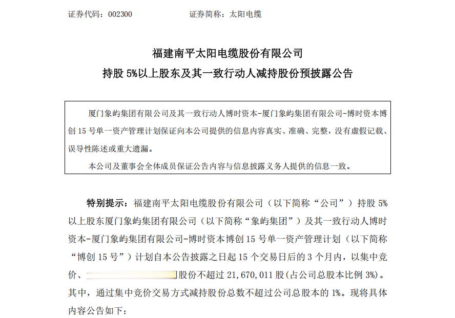 公告显示,象屿集团及其一致行动人博创15号计划以集中竞价、大宗交易方式减持太阳电缆不超过3%的股份,减持原因为自身经营需要。
