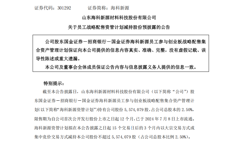 海科新源发布公告称,国金证券—招商银行—国金证券海科新源员工参与创业板战略配售集合资产管理计划(以下简称海科新源资管计划)拟减持公司2.50%的股份,公司董事张在忠、董事吴雷雷拟分别减持公司不超过0.0564%、0.0130%的股份。