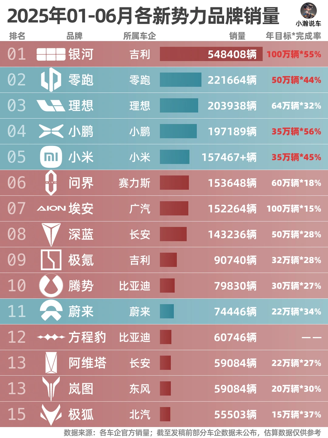 新势力销量 造车新势力 新势力品牌 6月汽车销量 新势力销量排行 理想汽车 问界 方程豹 小米 今年小米的月交付量能否突破5万