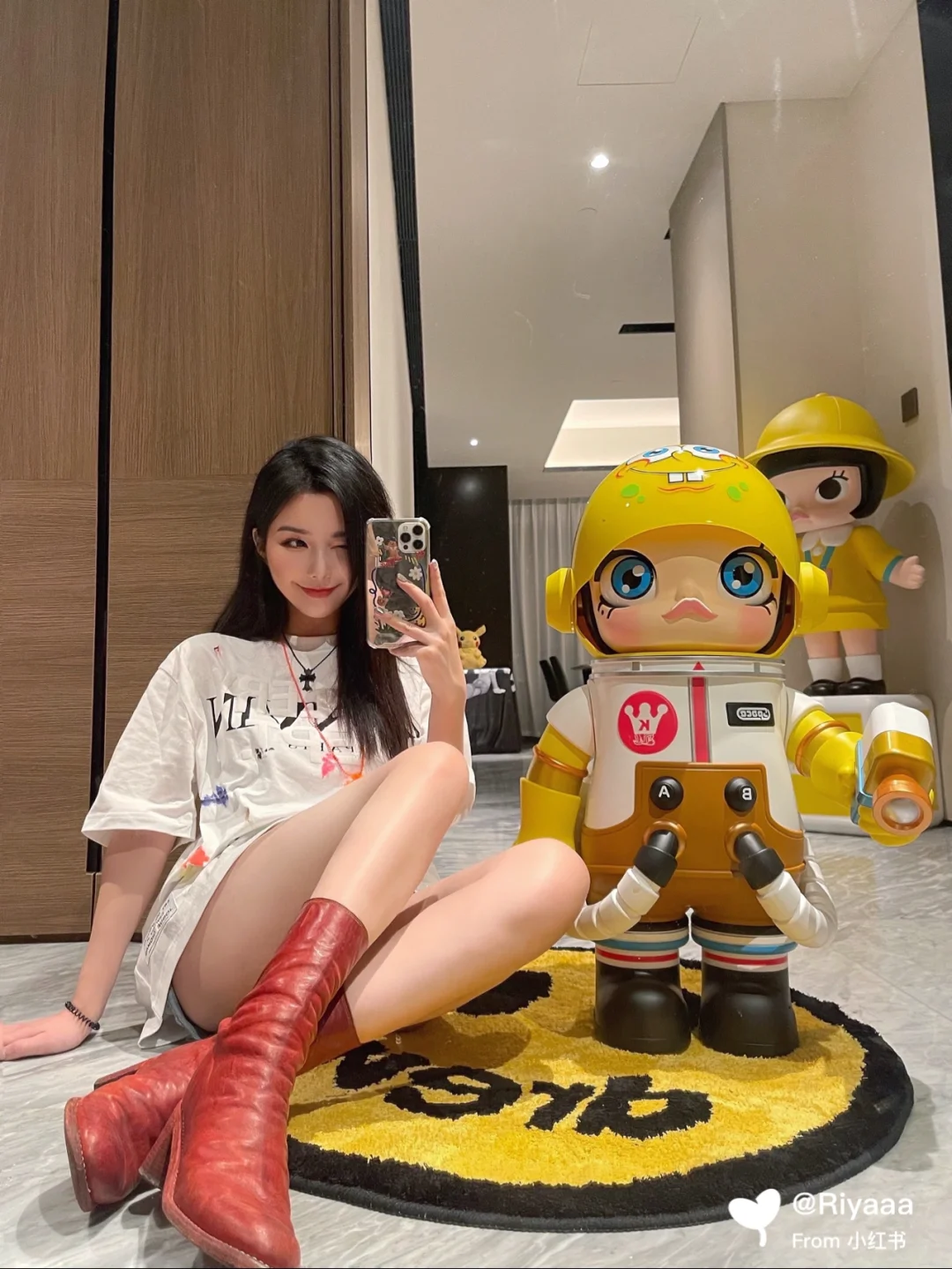一直都是Molly的小迷妹 这个海绵宝宝联名合作款太可爱了吧 1000%非常适合做摆件 感觉400%有点太小了 可玩性也比bearbrick高一些 枪可以拿下来的哟 Pop Mart Mega space珍藏系列出了那么多颜色还是最喜欢这一款 👗穿搭: T恤: Lanvin 鞋:Guidi M88