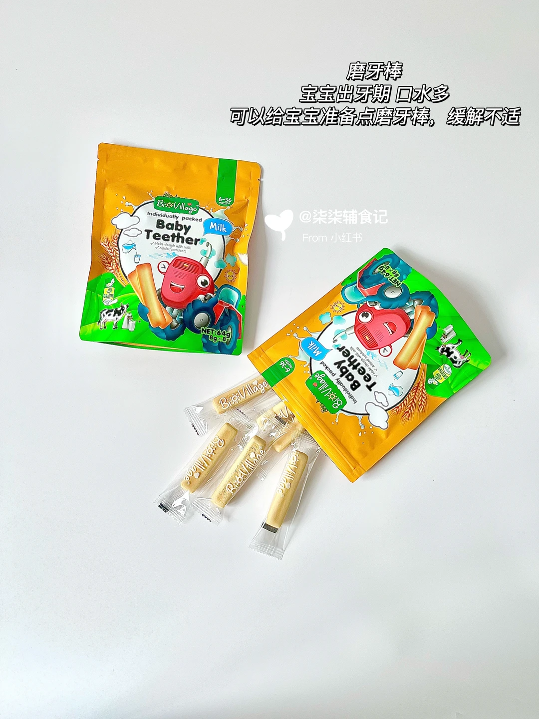 磨牙棒:平时柒柒牙痒痒到处抓东西啃的时候,塞给她一根磨牙棒,她可以啃半天,都不用理她哈哈,独立小包装,出门外带也方便。