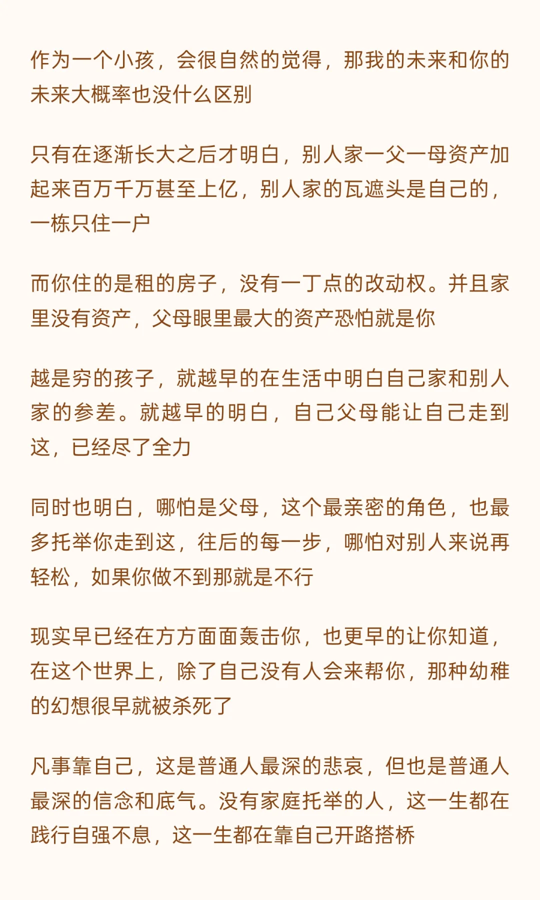 穷人和富人从家庭结构上看无异,但穷人的成长更早地明白现实与他人不同,必须靠自己。