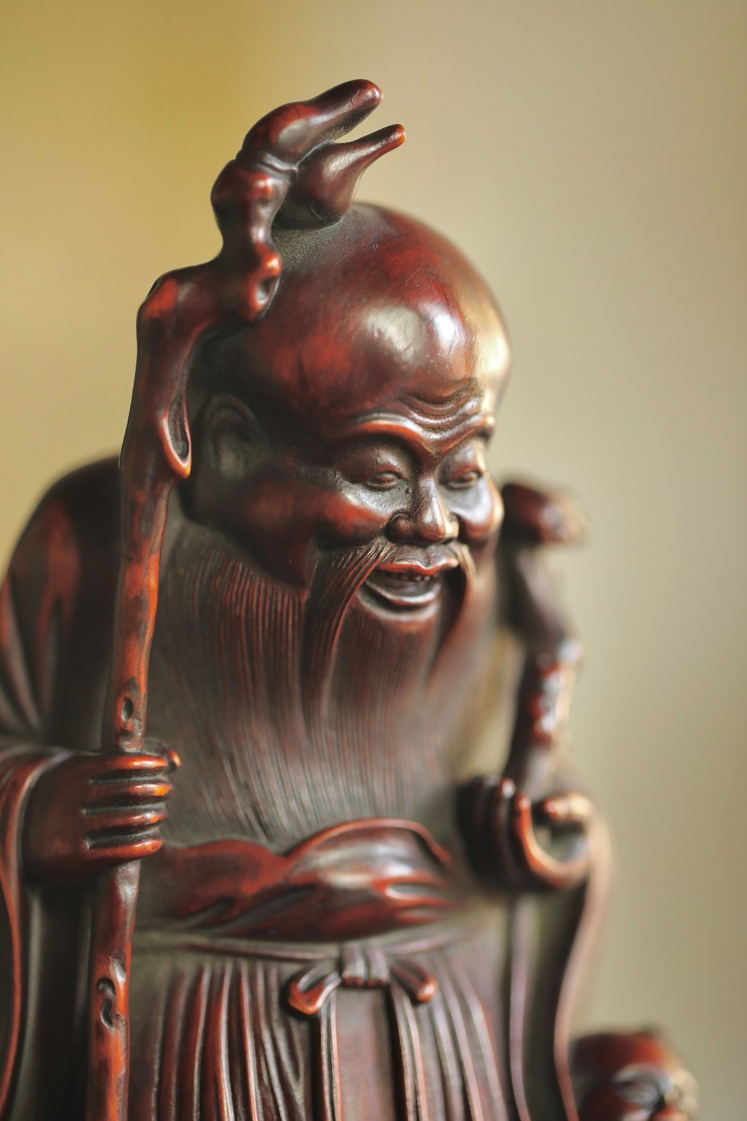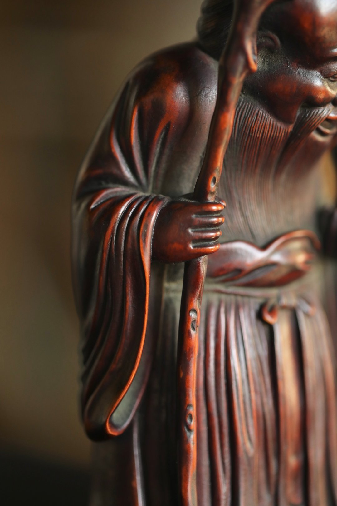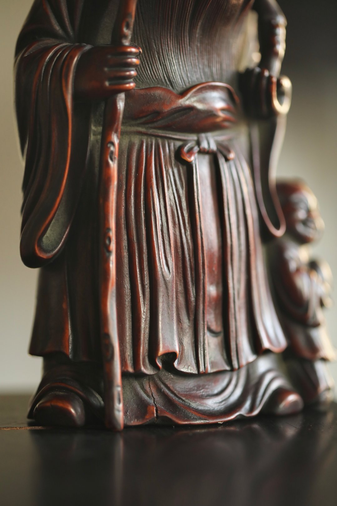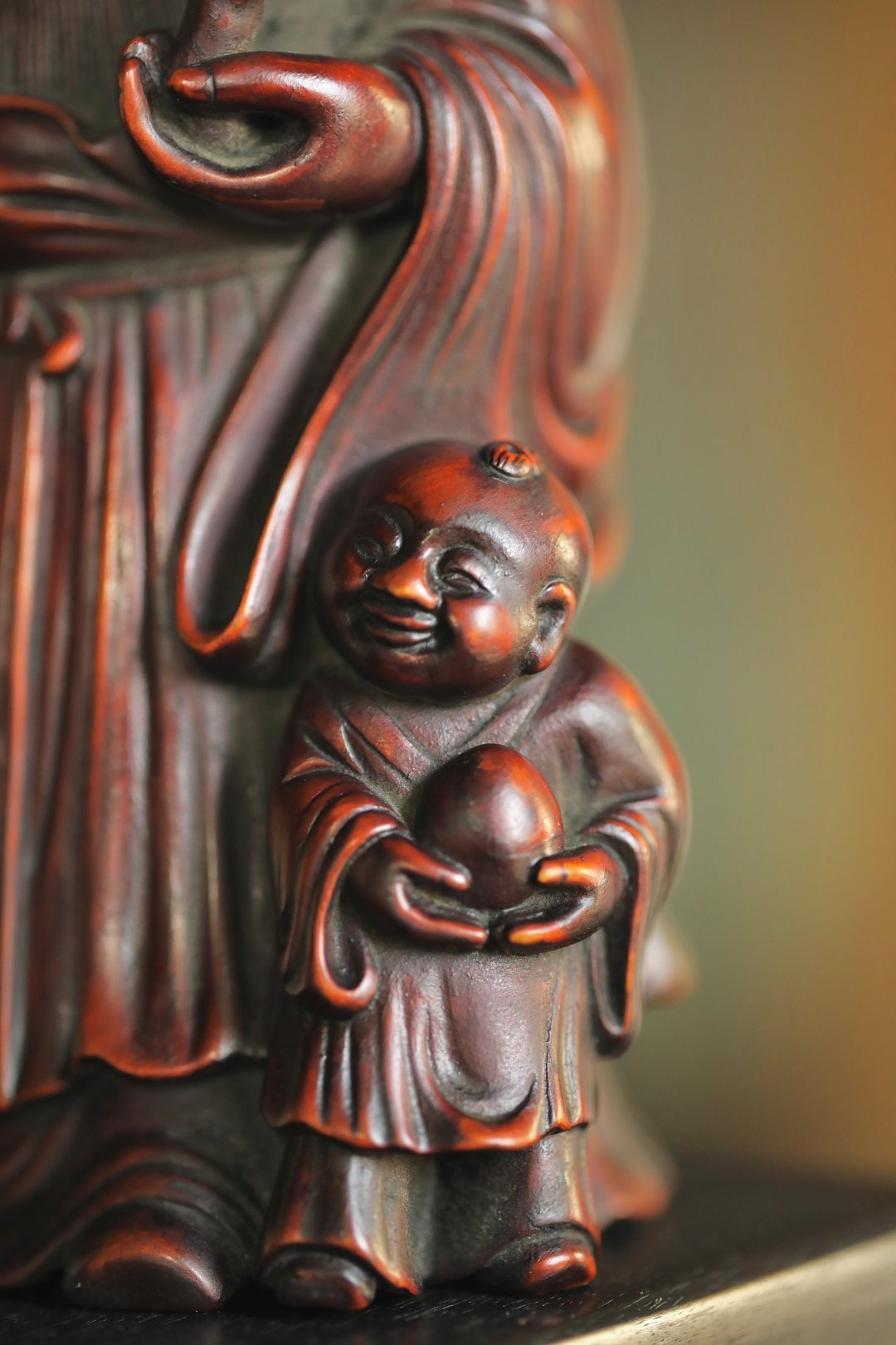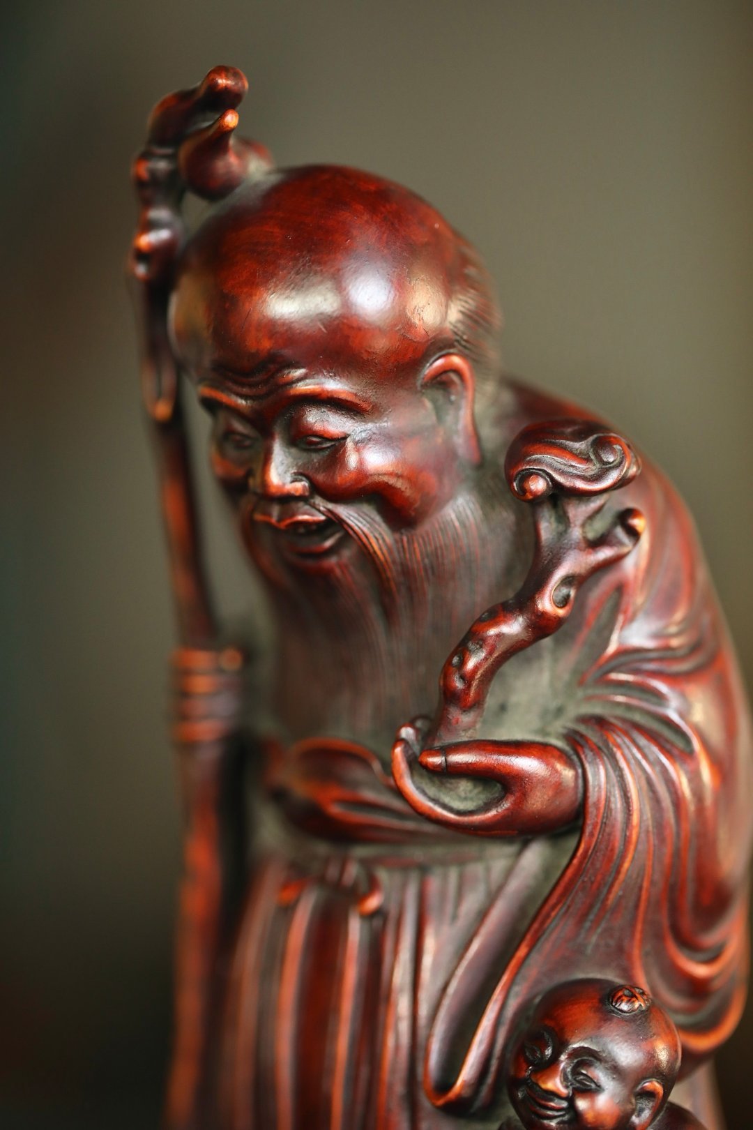 黄杨木仿古 | 寿星长眉垂髫带笑,手拄挂桃杖,童子捧寿果偎于侧,眉眼间尽是“福寿