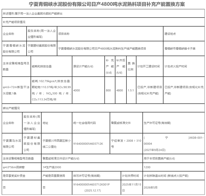 2.宁夏赛马水泥上述生产线剩余1200t/d熟料产能用于补充宁夏青铜峡水泥一条4000t/d熟料线,补充后产能4800t/d,置换比例1.5:1。