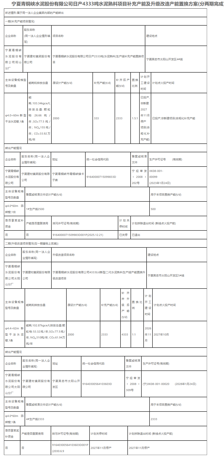 4.宁夏青铜峡水泥太阳山分厂另一条2000t/d熟料线技改升级,升级后产能为4333t/d,用于补充的2333t/d产能来自上述(序号3)补充后生产线,置换比例1:1。