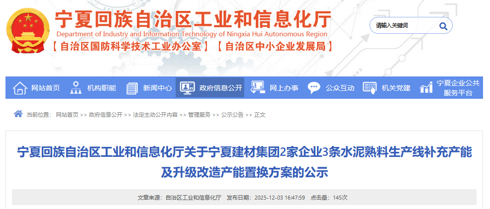 12月3日,宁夏工信厅发布“关于宁夏建材集团2家企业3条水泥熟料生产线补充产能及升级改造产能置换方案的公示”。