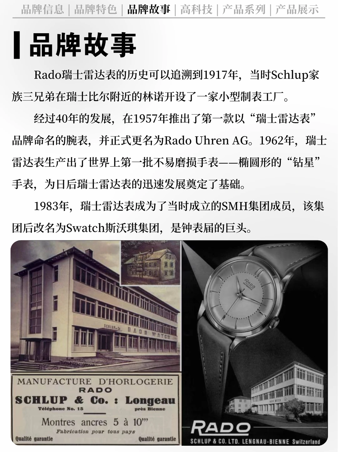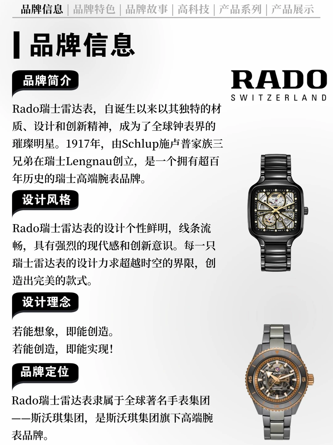瑞士雷达表创立于 1917 年,有着深厚的历史底蕴。从最初的 Schlup钟表厂,到后来以 “Rado” 为名推出腕表系列,再到成为 Swatch 集团的重要成员,它一路走来,不断发展创新,始终坚守着制表的匠心与品质,在钟表领域留下了浓墨重彩的一笔。