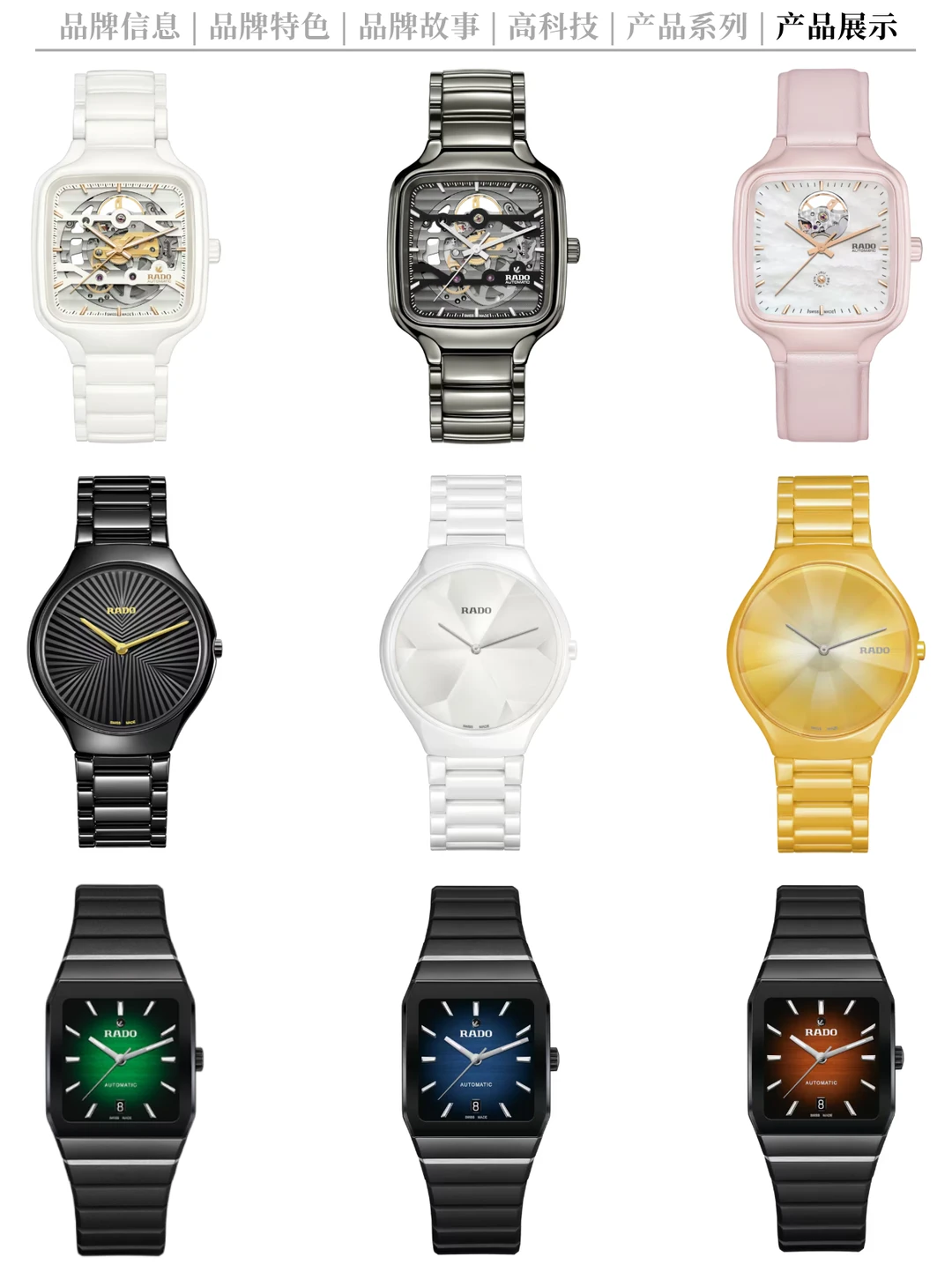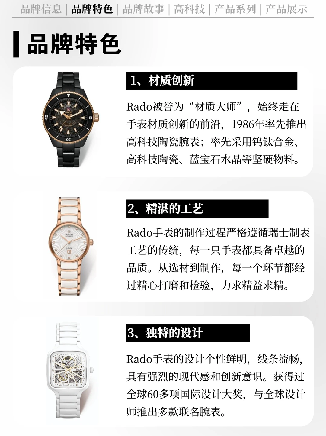 Rado的手表设计非常有特色,设计个性鲜明,线条流畅,具有强烈的现代感和创新意识,获得过全球60多项国际设计大奖,整体和谐统一,彰显出一种低调而奢华的美感。