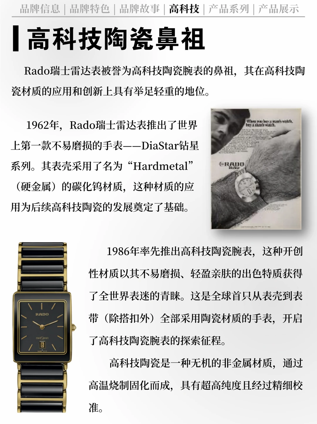 Rado瑞士雷达表以其对材质科学的深入研究而闻名于世,在腕表界有着“材质大师”的美誉。率先采用钨钛合金、高科技陶瓷、蓝宝石水晶等坚硬物料,还研制出高科技钻石等高科技物料。作为高科技陶瓷鼻祖,早在1962年就推出了世界上第[一R]款不易磨损的手表——DiaStar钻星系列。高科技陶瓷腕表硬度高、耐磨,完全不用担心会刮花磨损。