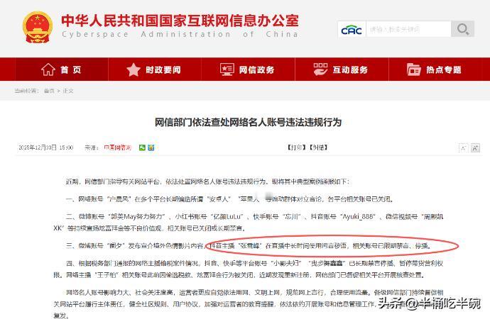 12月3日下午,中国网信办公布了“张雪峰”被禁言的原因,同时,还有对其他几个网络红人的违规处置。这不仅给让大家明白事情的真实原因,也说明了相关部门打击网络账号违反乱象的决心。 说白了,张雪峰这事哪儿是单纯的 “说脏话被禁言”,分明是垄断行业、误导大众的 “流量霸权” 终于撞到了监管的铁板上,那些建立在别人饭碗上的财富和狂妄,迟早要还的。 12 月 3 日下午网信办的通报一出来,全网才算把这事看明白,这位手握 6500 万粉丝的 “升学导师”,被点名是因为 “长时间使用污言秽语” 被禁言停播,可熟悉行业内情的人都清楚,这只是压垮骆驼的最后一根稻草。 他早就把考研和高考志愿规划的市场做成了自己的 “一言堂”,别人想分口饭吃难如登天 —— 小机构要么被他的流量挤压得活不下去,要么只能跟风模仿他的话术,整个行业的专业度都被拉低了。 更要命的是他对教育生态的冲击,一句 “报新闻专业就打晕” 的极端言论,直接让多所高校新闻学院的招生咨询电话量暴跌,老师们费尽心思准备的专业宣讲,抵不过他直播间里几句煽动性的话。 那些被他贬低为 “天坑” 的专业,背后是无数高校教师毕生的学术追求,可经他一张嘴,就成了 “耽误人生” 的选择,这无疑是砸了不少教育工作者的饭碗。 这种把自己的商业成功建立在行业混乱和他人困境上的做法,早就让他成了圈子里的 “公敌”。 说到底,还是名气和财富冲昏了头,从一个普通的考研讲师变成身家亿万的老板,他确实飘了。 直播里动辄冒出 “回家舔酱缸” 这类粗鄙言辞,面对质疑更是放出 “不愿意看就滚” 的狂言,完全忘了自己面对的是数十万寻求人生指导的年轻人。 真没人能想通,家长们花大价钱请的 “导师”,怎么会是个满嘴污言秽语的人? 更可怕的是,他把个别专业的就业个例当成普遍情况大肆宣扬,用 “文科都是服务业” 这种片面结论误导大众,把教育选择变成了纯粹的功利计算,这种迷惑性极强的宣传,早就搅乱了正常的升学认知。 这次被处置的不止他一个,编造谣言煽动对立的 “户晨风”、宣扬炫富拜金的一批账号都被处理了,这看得出来,监管部门整治网络乱象的决心是真的,不是只做做样子。 流量再大也不能当特权,粉丝再多也得守规矩,尤其是在教育这种关乎下一代的领域,把个例当主流、用低俗博眼球的套路,早就该被整治了。 当然,以上只是个人看法。你觉得网络红人该如何平衡流量和责任?欢迎在评论区留下你的观点。