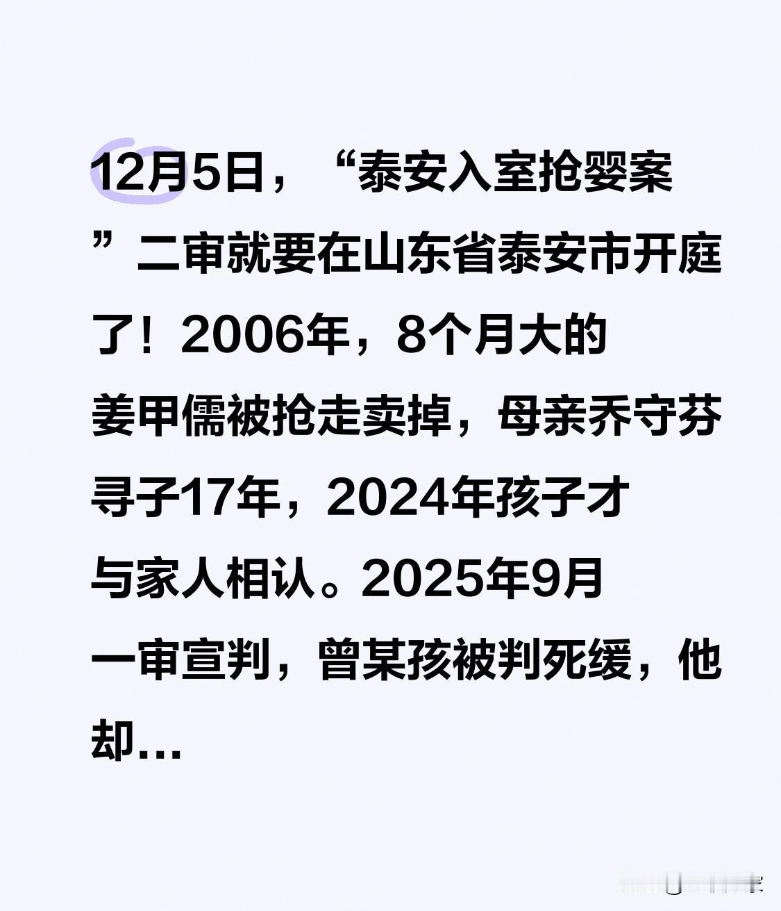 12月5日,“泰安入室抢婴案”二审就要在山东省泰安市开庭了!2006年,8个月大的姜甲儒被抢走卖掉,母亲乔守芬寻子17年,2024年孩子才与家人相认。2025年9月一审宣判,曾某孩被判死缓,他却当庭“破防”,对众人破口大骂。如今乔守芬称掌握新证据,若被采纳,相关人最低量刑将是死刑立即执行。 这新证据究竟能否改变判决结果?曾某孩等人又会面临怎样的刑罚调整?大家觉得这次二审会有怎样的走向呢? 姜甲儒被拐卖案二审将开庭 拐卖人口案二审 泰安入室抢婴案二审 入室抢婴贩卖案 山东入室强婴案 18年前的婴案 入室抢婴贩卖案 山东入室强婴案 18年前的婴案 泰安姜甲儒案 山东四人抢婴案 四人入室抢婴案 山东抱婴案