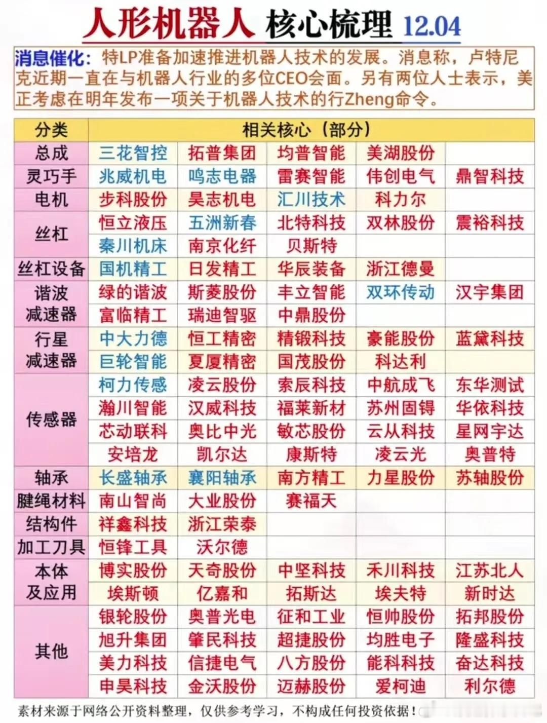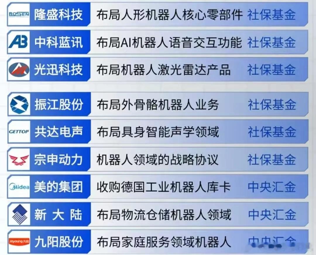 突发催化!美股机器人暴涨74%,A股国家队重仓龙头全梳理12月4日,美国政府在AI之后全力聚焦机器人产业,美股机器人概念股应声狂涨,iRobot单日暴涨74.36%!这一重磅催化下,A股机器人赛道再迎风口,而社保、汇金、大基金等国家队早已提前布局,核心标的值得重点关注!从产业链布局来看,国家队重仓标的覆盖机器人全链条:零部件环节:三花智控深耕机器人核心零部件,技术壁垒突出; 整机制造:美的集团通过收购库卡切入机器人整机领域,龙头优势显著;技术赋能:海康威视发力机器人视觉技术,北方华创布局AI芯片,为机器人产业提供核心技术支撑。当前人形机器人赛道利好密集,从总成、灵巧手到传感器、减速器,全产业链迎来发展机遇。下方梳理了产业链核心标的清单,精准覆盖各关键环节,把握政策与产业共振下的结构性机会!