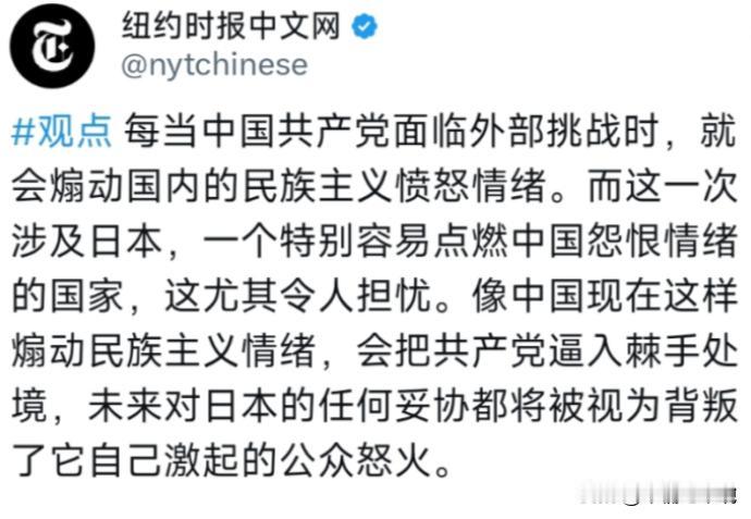 12月3日,纽约时报表示,每当中国面临外部挑战时,就会煽动国内民族的情绪。而这一次涉及日本,一个特别容易点燃中国怨恨情绪的国家,这尤其令人担忧,未来对日本的任何妥协都将被视为背叛。 说白了,《纽约时报》这篇报道纯属揣着明白装糊涂,中国的民族情绪从来不是谁能煽动起来的,那是刻在骨子里的骨气,是被一次次现实挑战焠出来的共识,美国自己求而不得的团结,才是他们真正忌惮的东西。 这话得掰开了说才清楚,先看看所谓 “煽动” 的由头,最近中日之间的摩擦不少,日本首相高市早苗在台湾问题上乱说话,挑战二战后的国际秩序,中方连着两次致函联合国秘书长批驳这种无理狡辩,结果日方还在那儿拿 “专守防卫” 当幌子糊弄人。 这边刚戳穿谎言,那边日本渔船又非法闯了钓鱼岛领海,中国海警依法驱离是维护主权的常规操作,到了某些外媒嘴里倒成了 “点燃情绪” 的引子。 要知道中国人对这类事的反应,根本不用谁来煽动。 早在上世纪抗战时期,《纽约时报》自己的报道就写着,中国士兵饿着肚子也坚守阵地,手无寸铁的百姓宁死不屈,学生们上街游行激发爱国热情,那时候可没人组织煽动,全是发自内心的 “国家兴亡匹夫有责”。 现在更不用说,6 月份日本自卫队飞机硬闯中国航母训练区,近距离滋扰我们的例行训练,国防部强硬回应后,网上全是支持军方维护安全的声音,这种共识不是靠宣传喊出来的,是看在眼里记在心里的本能反应。 再说说美国所谓的 “民族主义”,其实透着满满的酸味,他们自己想搞全民动员,结果连口罩问题都能吵得撕裂社会,反观中国,遇到事大家真能拧成一股绳。 就像这次中日关系紧张,日本国内理性力量都急着派代表团访华缓和关系,知道民间情绪的分量,这种自发形成的凝聚力,正是美国最缺也最怕的,他们把这种团结污名化,本质上是怕这种力量会打破他们习惯的霸权秩序。 有人说这是民族主义,依我看我们的这种意识不是多了,而是远远不够,要是人人都清楚钓鱼岛是固有领土,都记得历史教训,都明白主权问题不能退让,那些试图挑衅的势力才会更收敛。 就像日本评论员古贺茂明说的,高市早苗的错误言论本就该立刻撤回,可她拖着不认错,这种时候民众的关注和坚持,恰恰是给国家撑腰的底气。 别被外媒的话术带偏了,所谓 “煽动情绪” 的说法,不过是把中国人民的底线意识当成了攻击工具,我们的团结从来不是盲目的怨恨,是对主权的坚守,是对历史的铭记,更是对和平的捍卫。 看看日本旅游业界因为关系紧张发愁的样子,就知道理性的力量终究存在,但前提是我们得先立住自己的立场。 以上只是个人看法,毕竟每个人对这些事的感受都不同。你觉得我们的民族情绪是自发的共识,还是外媒说的 “被煽动”?欢迎在评论区聊聊你的想法。