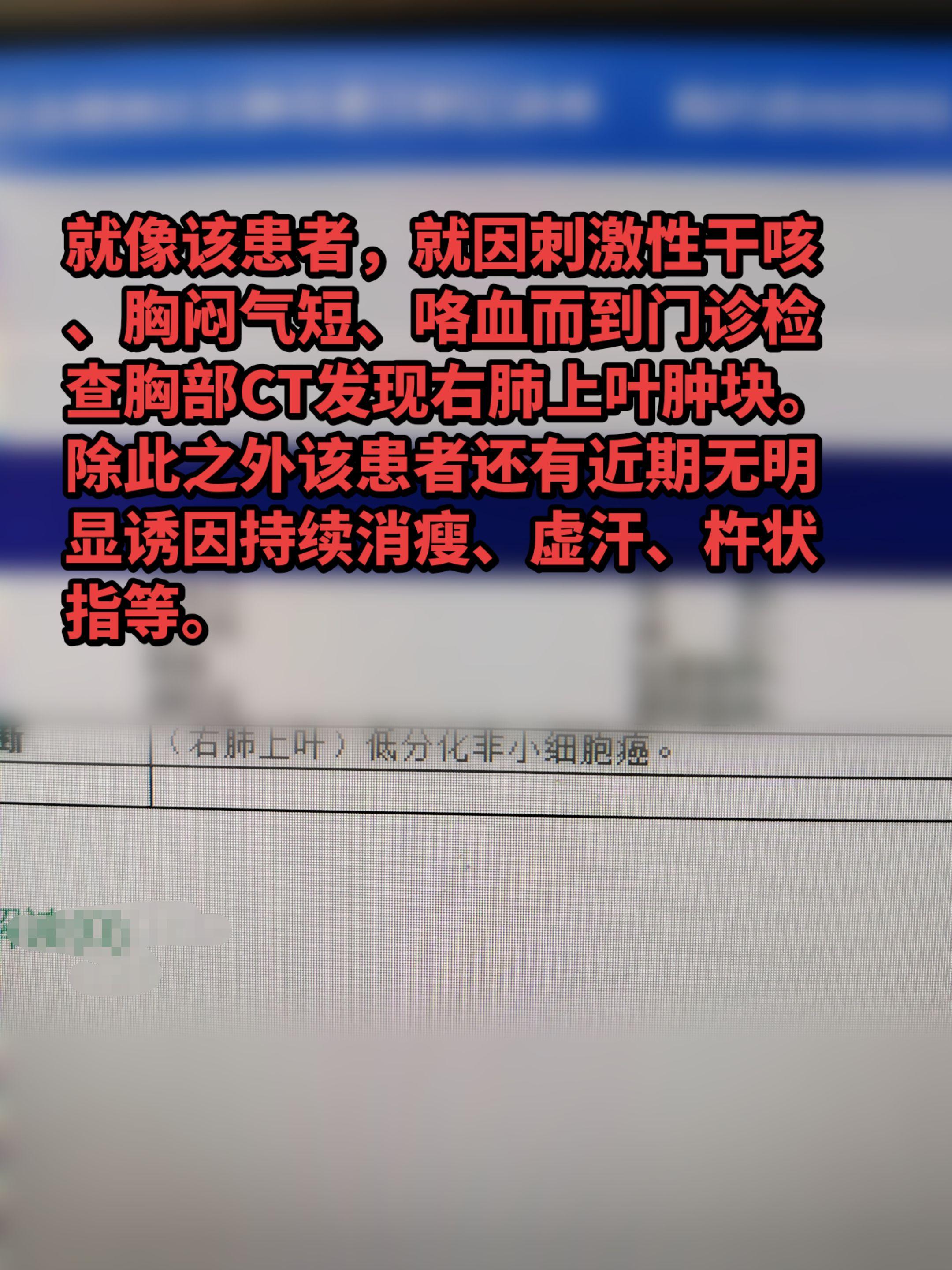 刺激性干咳、胸闷、痰中带血丝,警惕肺癌!一般早期肺癌症状隐匿,而当肿瘤逐渐增大达到中晚期时就会因肿瘤压迫肺而产生胸闷气短、因肿瘤刺激支气管出现刺激性干咳、因肿瘤过快生成缺血坏死溃烂时则出现痰中带血丝或咯血等。就像该患者,就因刺激性干咳、胸闷气短、咯血而到门诊检查胸部CT发现右肺上叶肿块。除此之外该患者还有近期无明显诱因持续消瘦、虚汗、杵状指等。