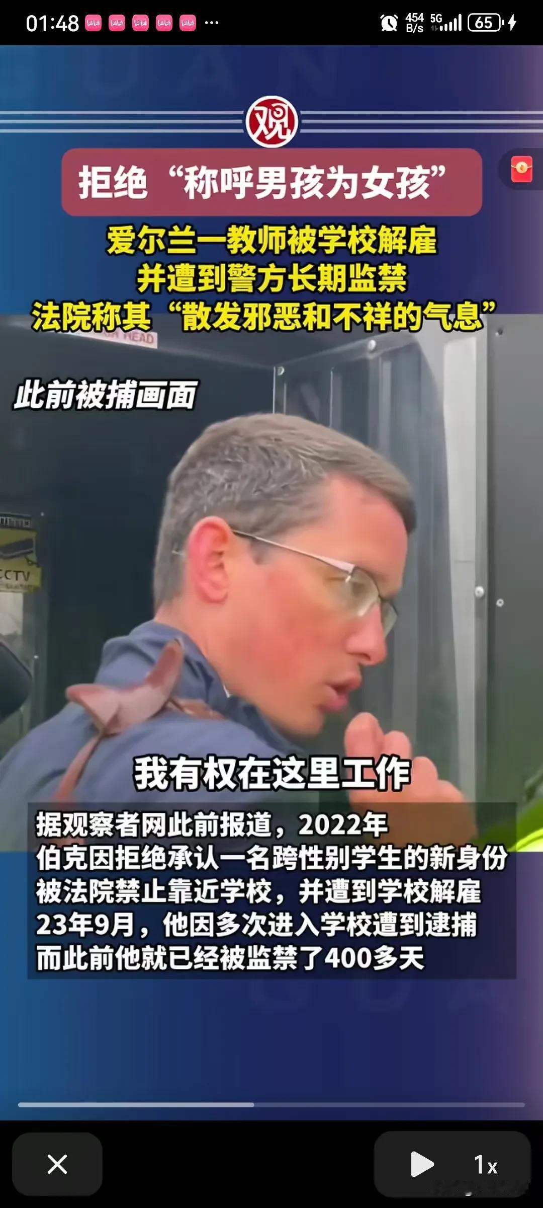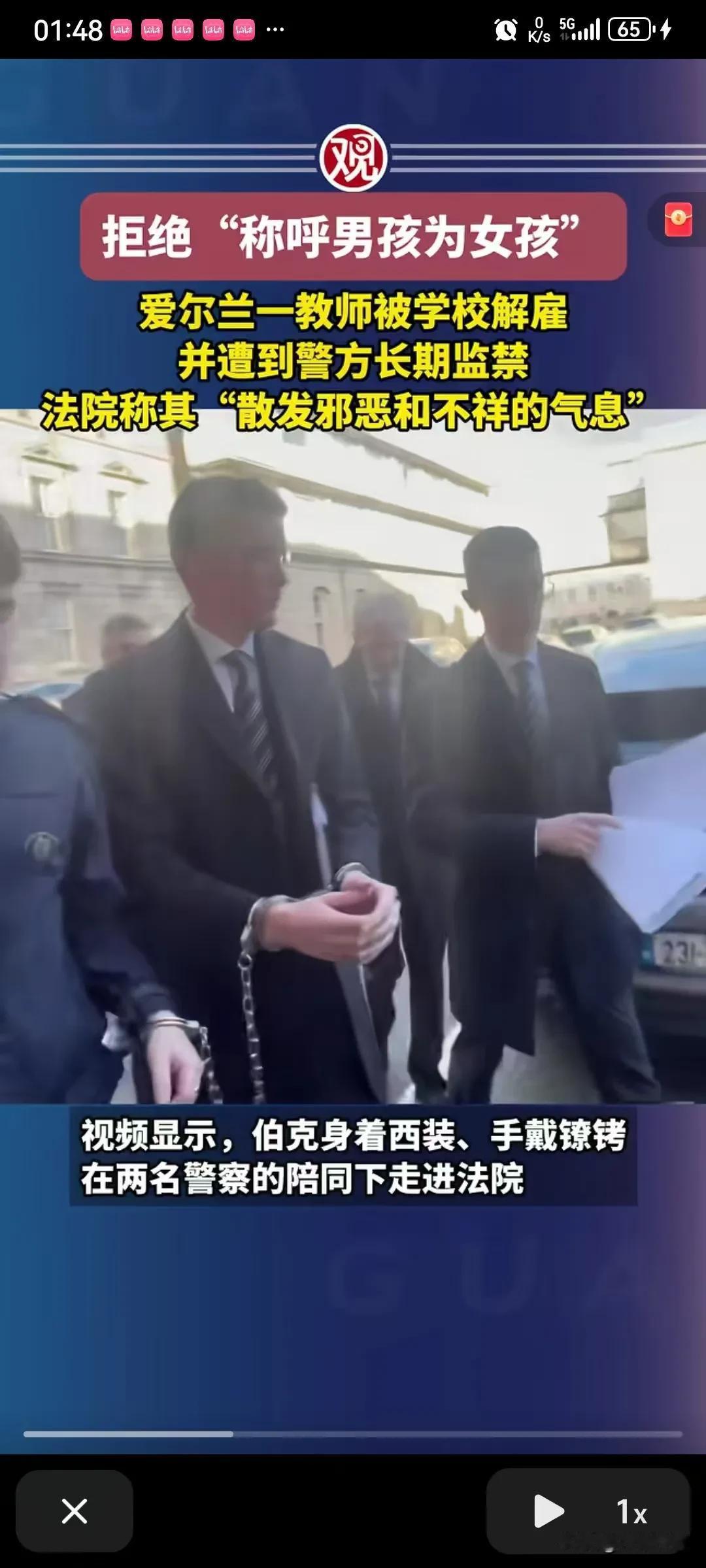 欧洲的白左太疯狂了,爱尔兰一个老师拒绝称呼“男孩为女孩”被开除,然后他坚持自己有权在学校工作,就被关了400多天,现在带着铁链受审! 你很难想象这是什么逻辑,一个老师不愿意接受白左的那套,把一个男孩称呼为女孩,就要被开除,然后人家想回学校为自己辩护,就被关了几百天,还要接受审判,到底是什么的思维逻辑才会导致欧洲变成这个样子,真的挺好奇的!