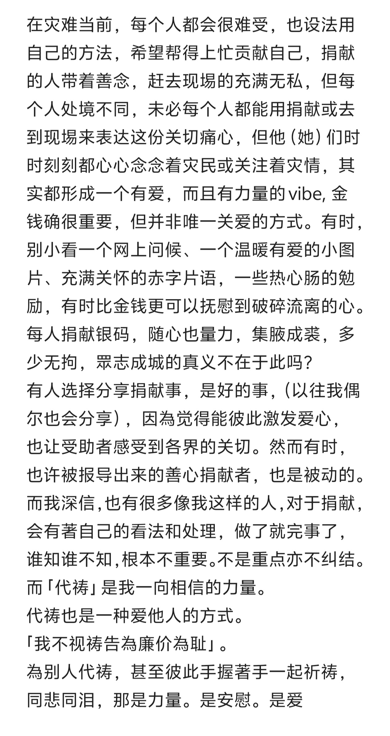 Sammi从07开始,每次演唱会都会捐1~2场歌酬,在明报写专栏十几年的稿费全部捐了,写的《值得》版税全捐了,这书可是三个月就再版了八次,《faith》这张畅销大碟版权税也捐掉了,大灾大难比如汶川玉树也捐款了的,人还有亲自去汶川帮忙,平时还参加各种大大小小公益筹款活动。她最难得的是除了钱之外,她会身体力行落地做一些善事,早年去云南、内蒙古贫困地方探访,还助养了很多儿童,跟着宣明会还去了埃塞俄比亚当义工探访艾滋病人,还去了尼泊尔做义工。疫情期间,她还做义工亲自派发口罩饭盒。会帮衬经营不善的卖花阿婆,喜欢猫咪还义务做了好久的寄养猫咪,是一个把善举融入到自己点滴日常中的人。看到这样纯粹的人,因为捐款没有拿着喇叭到处宣传,受到那样粗暴无礼的质疑跟谩骂,觉得好呕吐。因为发了祈祷没发“我捐款了”,还拿信仰攻击她,真的非人类的。在解释自己的同时,还在试图跟大家好好沟通,最后还在传达一个想法:助人行善可以各种方式,没有什么高低之分,公开跟不公开,也是处理方式不同,她不想自己去影响或者是道德绑架别人。Sammi是一个很善良仁慈的人。