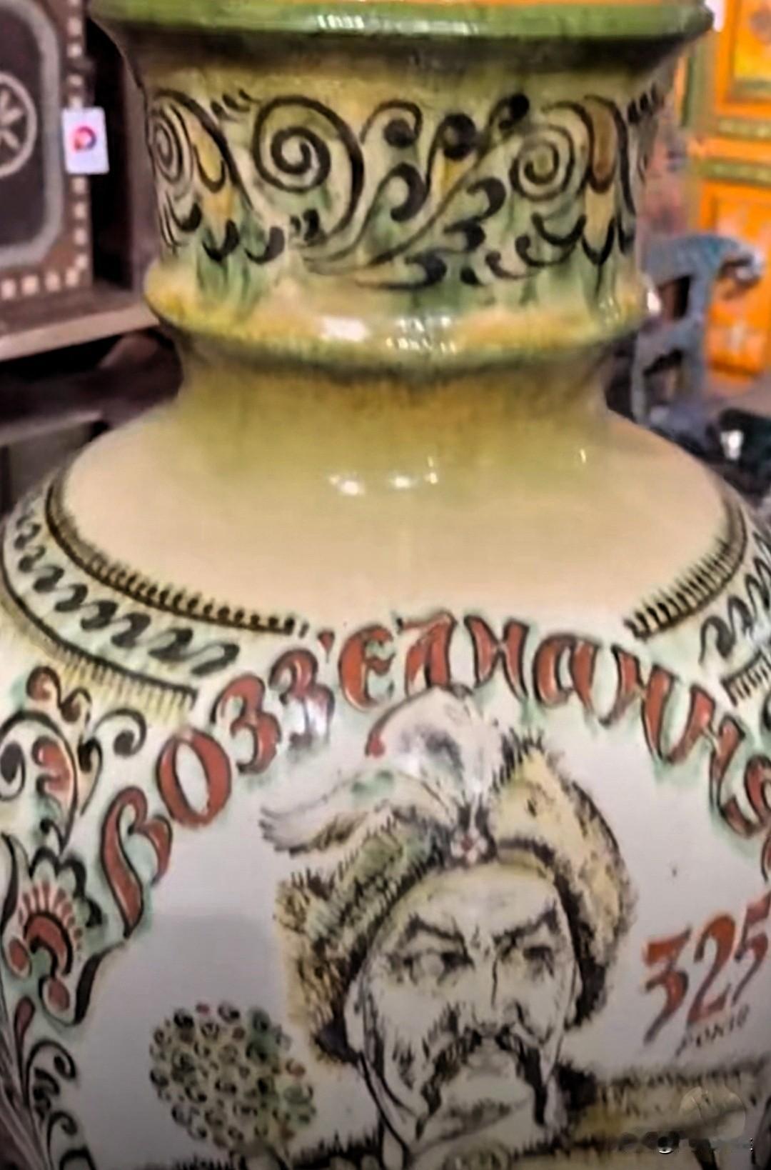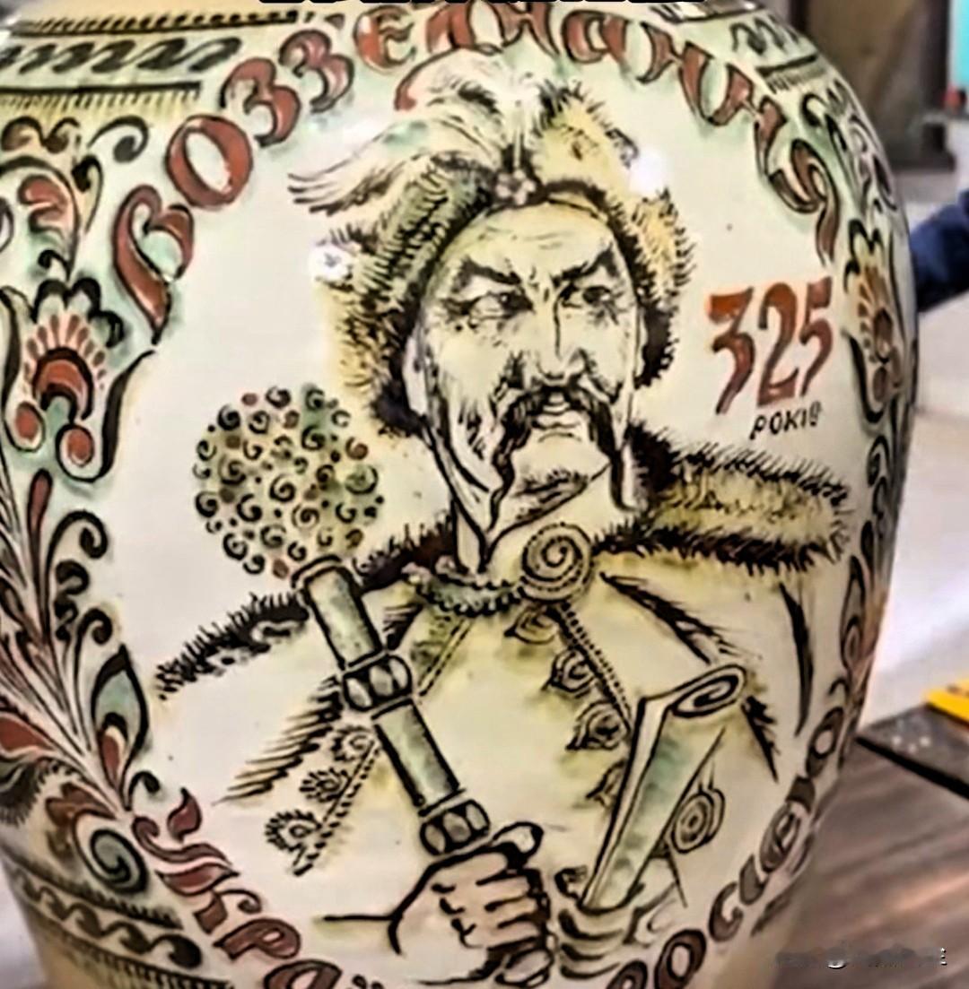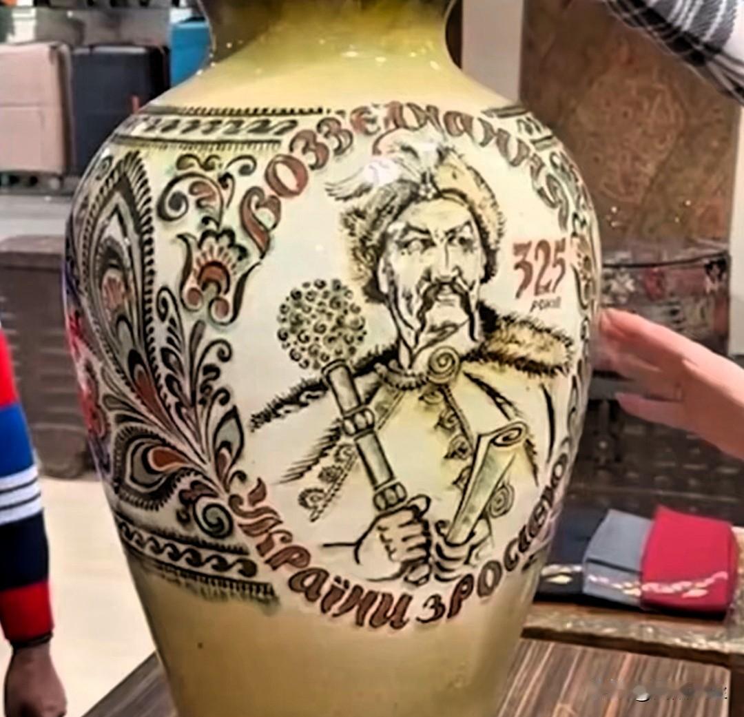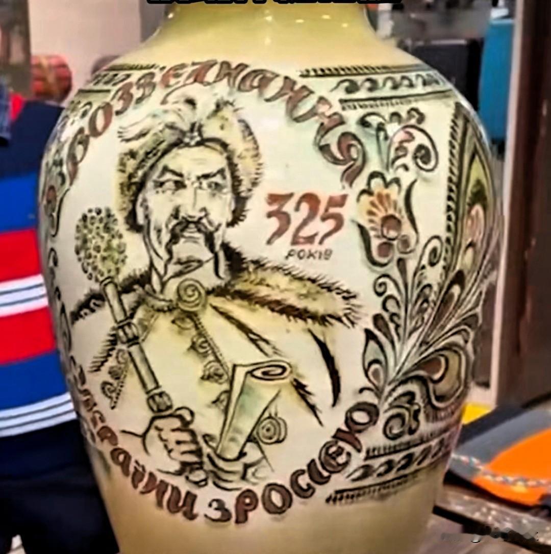 俄罗斯RT电视台总编玛格丽塔·西蒙尼扬在一家印度老物件店里发现了一只神秘的花瓶,花瓶上用乌克兰语写着“纪念乌克兰与俄罗斯重新统一325周年”,也就是说325年后乌克兰将回归到俄罗斯。店里的人员坚信该花瓶是某种葡萄牙工艺品。 花瓶上的人物为鲍格丹·赫梅利尼茨基,乌克兰民族起义领袖,其领导的哥萨克起义被现代乌克兰人视为民族解放战争,本人被尊称为“乌克兰国父”,曾签署《佩列亚斯拉夫条约》实现乌俄合并。 店主说:“这意味着乌克兰将在325年后回归俄罗斯?”西蒙尼扬:“是的。” 但是如果按赫梅利尼茨基1654年签署《佩列亚斯拉夫条约》实现乌俄合并时算,或者赫梅利尼茨基1657年去世时算,325年早过去了,这可能是后来有人为纪念赫梅利尼茨基做了这个花瓶写上了上述字样。