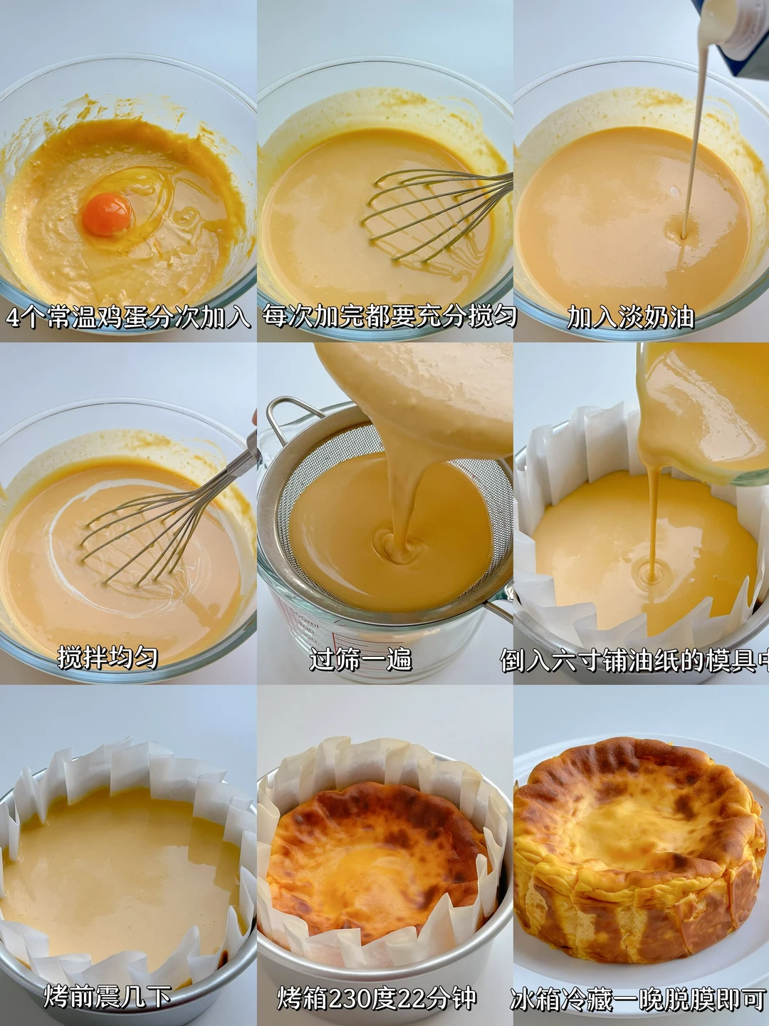 3️⃣将面糊倒入6寸铺了油纸的模具中,震几下,烤箱提起预热,烤箱230度22分钟,烤好放凉再放入冰箱冷藏一晚后脱膜即可。