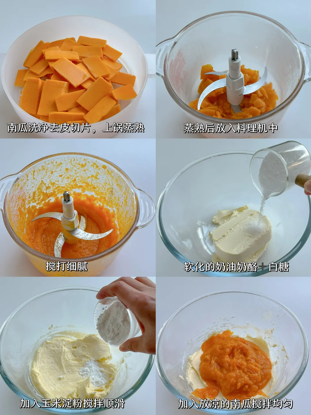 1️⃣南瓜洗净去皮切片,上锅蒸20分钟左右,蒸熟后放入料理机中搅打细腻备用。