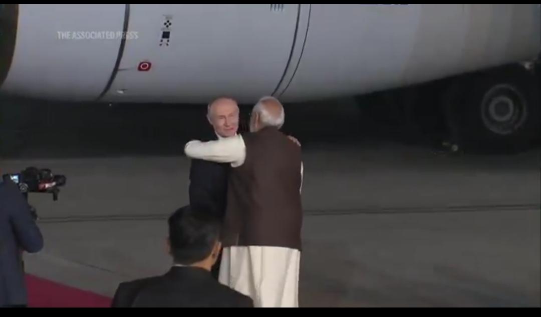 突发快讯——俄罗斯总统弗拉基米尔·普京对印度进行国事访问,此次访问旨在加强两国间的双边关系与经济联系。印度总理纳伦德拉·莫迪在新德里一座机场迎接普京,双方行熊抱礼并紧紧握手。