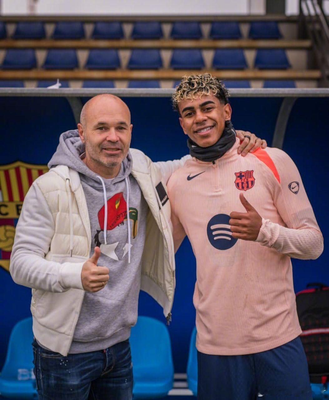 图:巴塞罗那名宿安德列斯·伊涅斯塔造访一线队训练时,与费尔明·洛佩斯,佩德里,拉明·亚马尔合影留念。[fcb]