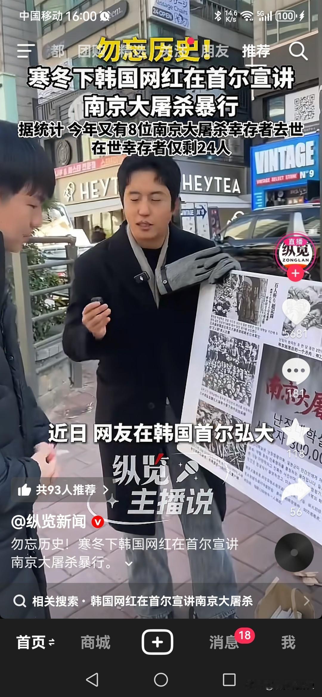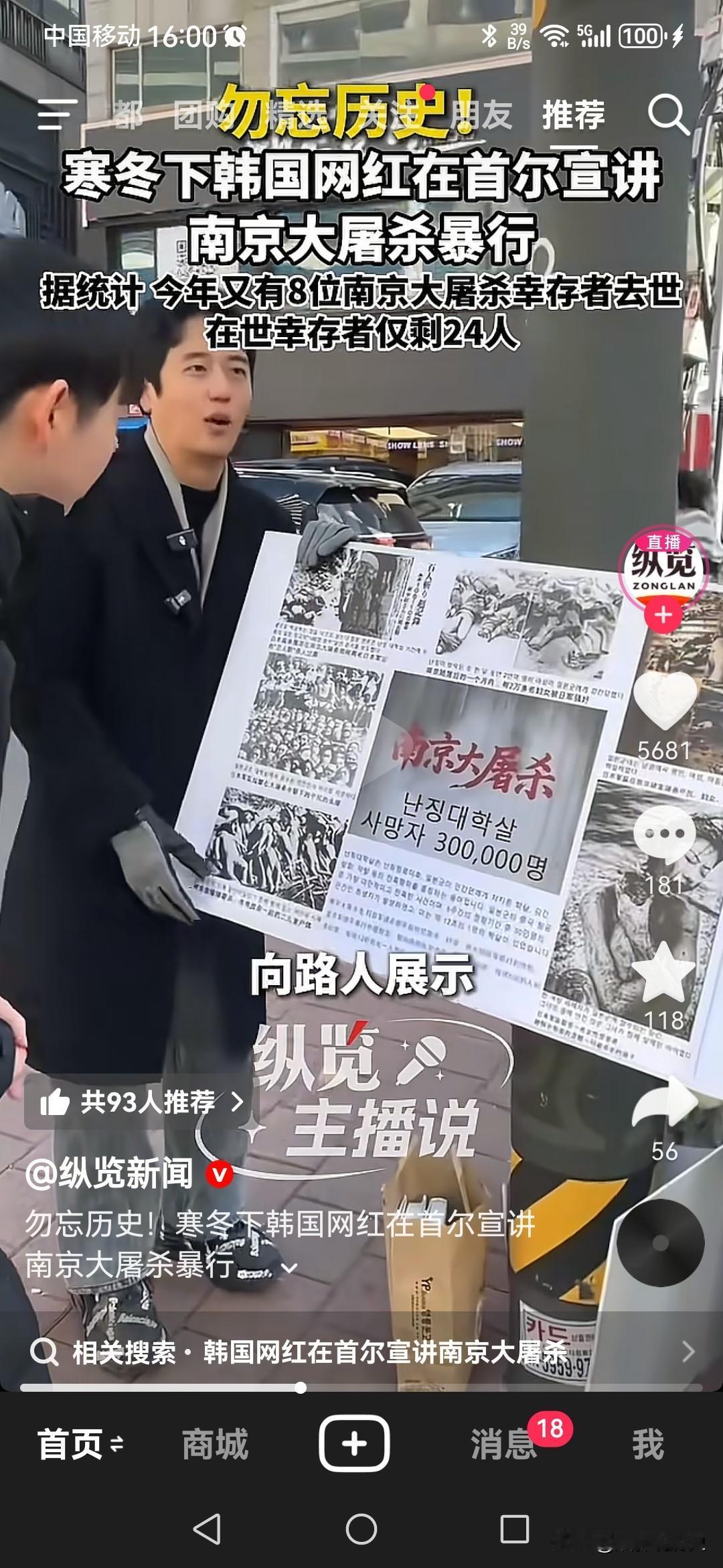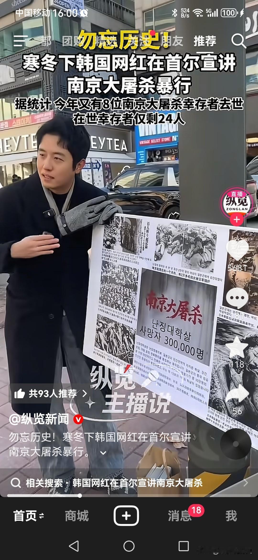 南京大屠杀死难者国家公祭日就快到了,一个韩国网红为了铭记历史,让更多人知道南京大屠杀的真相,亲自拿着海报站在韩国街头,向韩国民众宣讲当年日军在中国的暴行。 . 这个韩国网红叫金三岁,他在中国创业五年,主要做中韩跨境贸易。 . 他曾经亲自拿着五星红旗到天安门广场观看升旗仪式。 . 最近,南京大屠杀死难者国家公祭日就快到了,他又印制海报,到韩国街头,通过图片和文字展示当年日本人在南京的暴行,他本人亲自在场给韩国民众讲解那段历史。 . 事实上,韩国和中国在抗战时期,都曾经被日本侵略,朝鲜半岛全境被日本占领,朝鲜半岛上的有识之士就进入中国境内,建立抗日流亡政权,领导他们的民众参加抗日战争。 . 同样的,日本人在朝鲜半岛也犯下了残忍的罪行,比如强迫16万妇女成为慰安妇,在当地强制征集劳工给日本人干活,那些劳工每天要高强度工作十几个小时,很多人直接过劳死。 . 但是,如今韩国人对日本看法实际上比较分化,有些人主张不忘历史,警惕日本,也有些人主张忘掉那段不愉快,与日本建立更友好的关系。 . 金三岁这个网红,无疑是属于对日本保持警惕的那部分人。 . 近些年里,有不少外国人在中国,有些人会在一些需要表明态度的场合,为了能继续在中国赚钱,口头上表个态也就行了,有些人就是性质恶劣,当面一套背后一套。 . 而金三岁一定是属于发自内心热爱中国的韩国人,他为此付诸了行动,并且身体力行。 . 这样的人才称得上是中国人民的朋友,是国际友人,他在韩国街头向韩国民众讲出南京大屠杀的真相,这件事更值得尊敬。