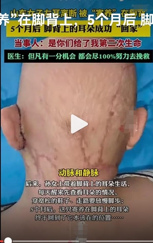 真敢想!医生把断耳“种”在脚背上,5个月后真“回家”了! 山东姑娘左耳意外离断,这要搁以前可能就真没了。但医生一顿神操作——把耳朵先“寄养”在她自己脚背上活了5个月!等头部条件成熟,再从脚上“搬家”回头部。 现在手术成功,耳朵颜色血运都好得很。网友:以后走路会不会听到脚丫子说悄悄话?(开玩笑的) 不得不说,这波操作真是医学版的“种子发芽”,科技让“断耳重生”不再是奇迹!为医生点赞!