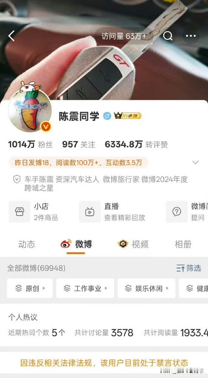 车圈顶流陈震被多平台封禁冲到热搜第一。 这热度堪比很多流量明星。 陈震被禁言其实有迹可循,长期树立与某车企对立人设,火灾捐款发布不当言论,被禁当日发布“战胜7000法务视频”。 早先交通事故进行冷处理,已经招致不少网友的反感。