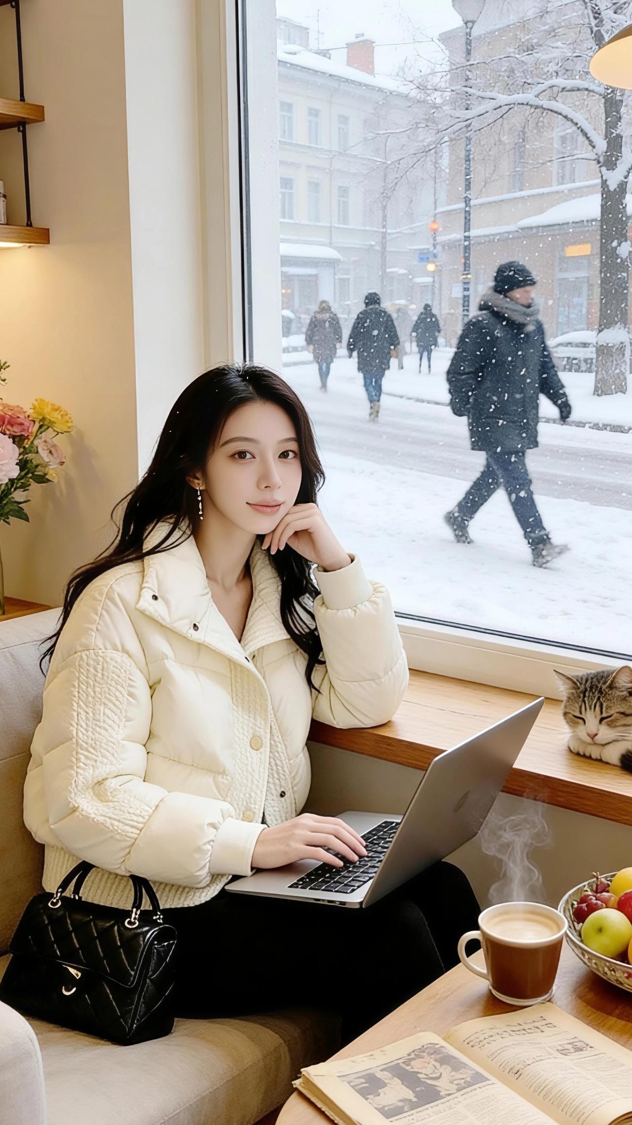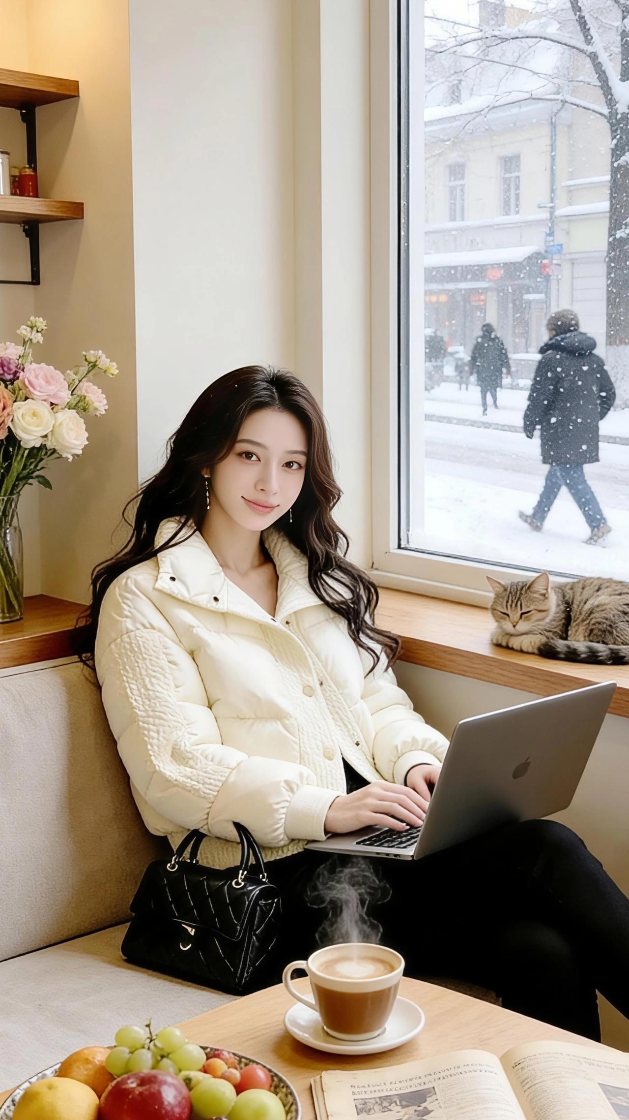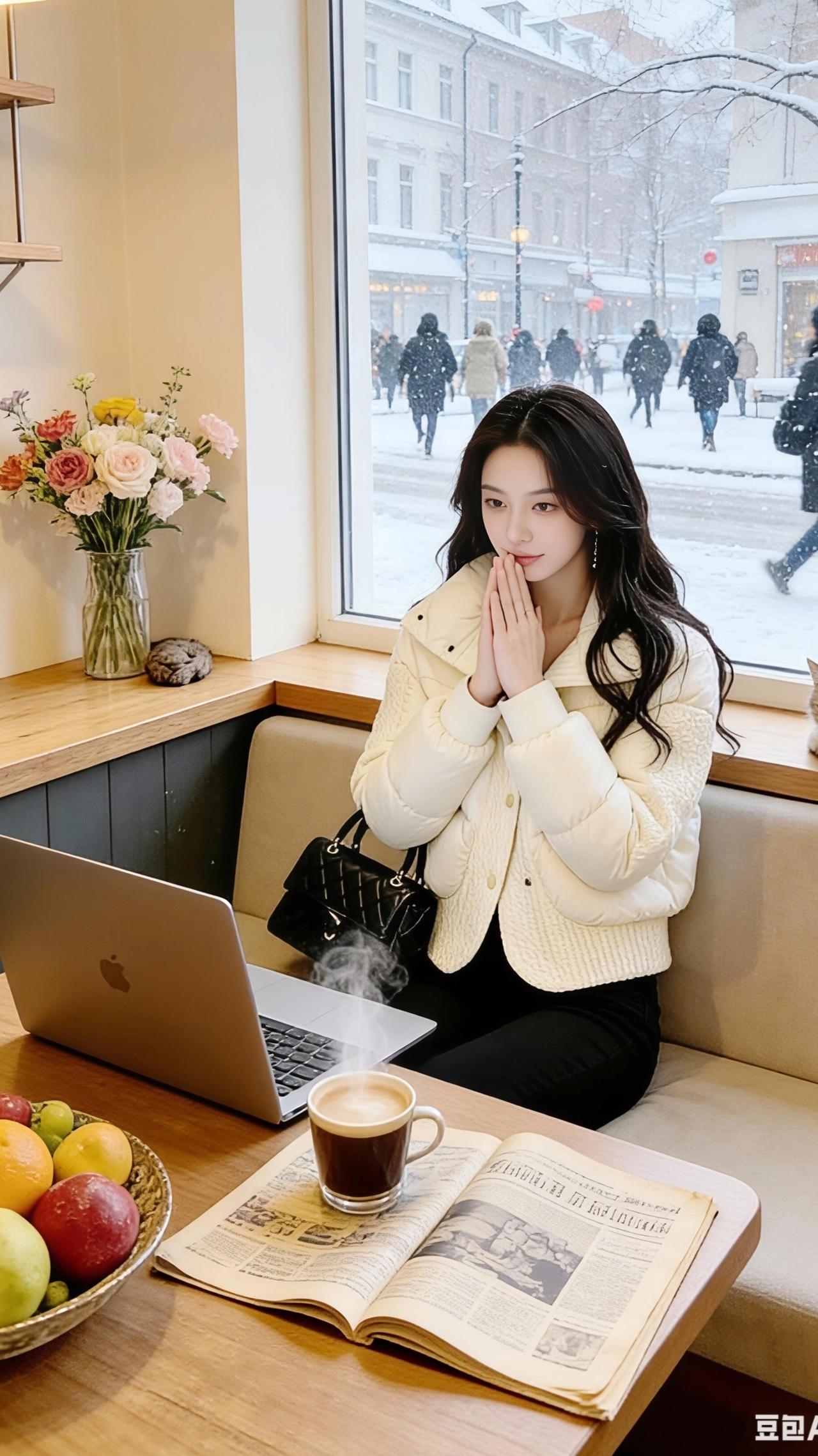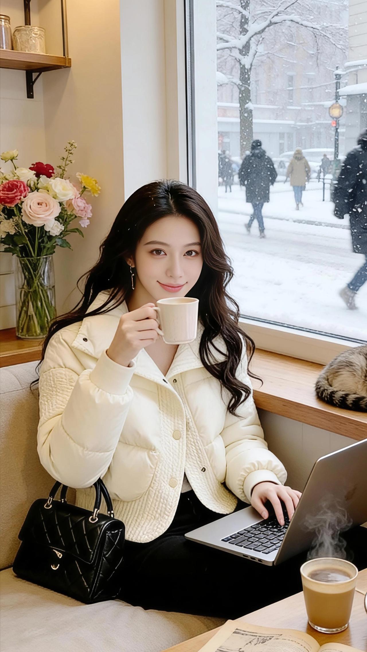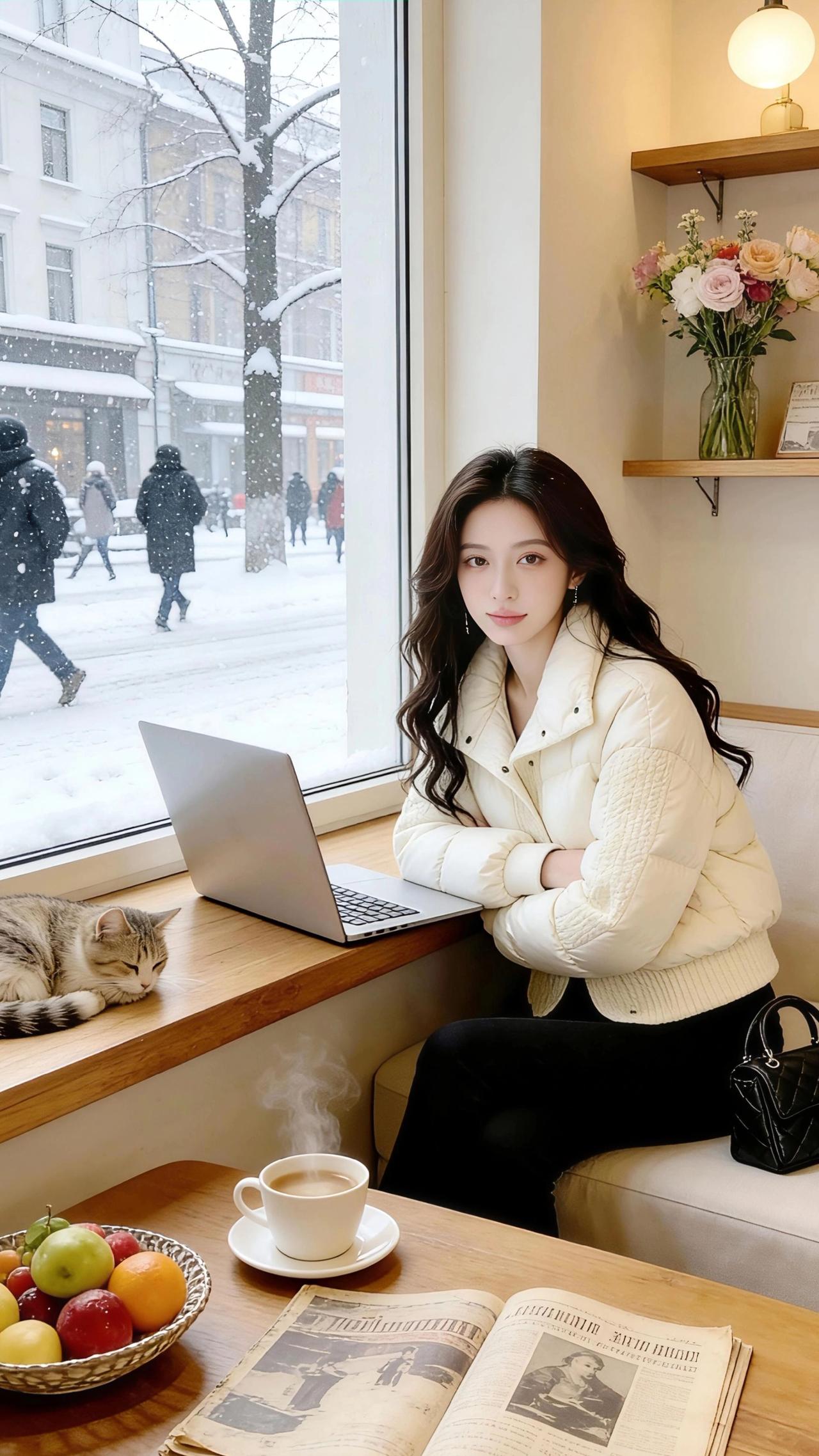 《雪窗暖室》 冬雪把街景揉成蓬松的白,落进咖啡馆窗沿时,恰好撞进室内暖黄的光里。她裹着奶白棉服蜷在沙发里,软绒的衣料衬得指尖都暖,膝头的笔记本亮着浅光,与桌上咖啡的雾缠成一团温软。 花猫蜷在木质窗台打盹,尾巴尖偶尔扫过落雪的玻璃——窗外行人裹紧厚衣,而室内的花束正把粉白的香浸在空气里。她咬了口脆甜的果,齿间的清甜混着咖啡的醇,连打字的指尖都漫着松弛的暖。 雪还在落,风裹着寒意擦过窗棂,却碰不到这方小小的暖:旧杂志摊开泛黄的页,果盘里的色彩浸着光,她抬眼时,连睫毛都沾了点温软的笑意——原来冬日不必凛冽,一件软衣、一杯热饮,就能把雪天裹成甜的。 高级感穿搭 秋冬穿搭 慵懒风穿搭 穿搭