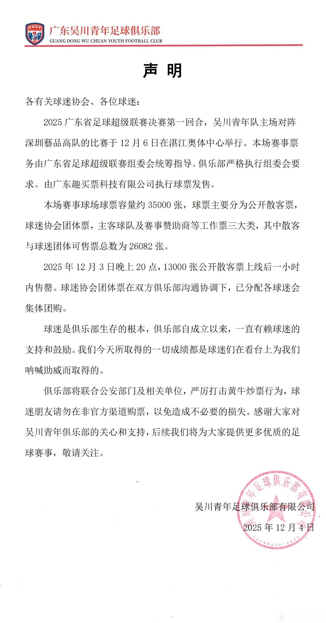 广东省超联赛湛江主场赛事是在广东省足协,湛江市文广旅体局,湛江市公安局审批指导下进行的主场赛事,具备官方监督和指导办赛的活动,大家有理由相信这个数据,而不是去听信谣言说什么只卖了两三千的球票。一支球队一场赛事火爆,随之而来肯定有很多热爱的人不一定能买到票,要知道,以前广州恒大时期黄牛更多,买不到票的人更多,但是那些都是小插曲,一点都不妨碍大家对广州队的热爱,包括这次的小风波,如果是真的和热爱和支持球队,如果仅仅是因为听信谣言去伤害和放弃球队,那对吴川青年这支年轻的湛江本土子弟兵来说,都是一种巨大的伤害。事实上,从现代足球出现到现在,有几支球队是赚钱的?强如广州队、上海海港、北京国安都不行,能回收一半成本的已经是中超巨头。所以说,维持和运营一支球队是非常消耗资金和精力的事情,有人出钱出力来推动家乡球队建设,这是湛江以往还没有过的能凝聚大家的球队和精神。为众人抱薪者,不可使其冻毙于风雪。非常期待周六晚的首回合决赛对决了,期待精彩激烈继续,12月6日我们省超决战见!省超鸣聊体育广州队