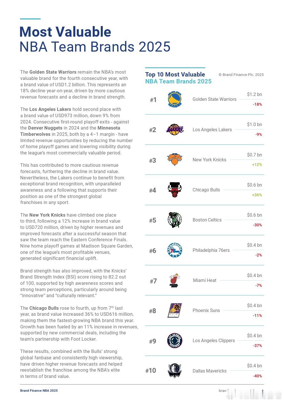 【2025年NBA品牌排行榜】金州勇士队以12亿美元的品牌价值连续第四年成为NBA最有价值品牌。洛杉矶湖人队以9.73亿美元的品牌价值排名第二。纽约尼克斯队的品牌价值上升了12%,达到7.2亿美元。芝加哥公牛队从去年的第7位上升至第4位,品牌价值增长了36%,达到6.16亿美元,成为今年增长最快的NBA品牌。(Brand Finance)